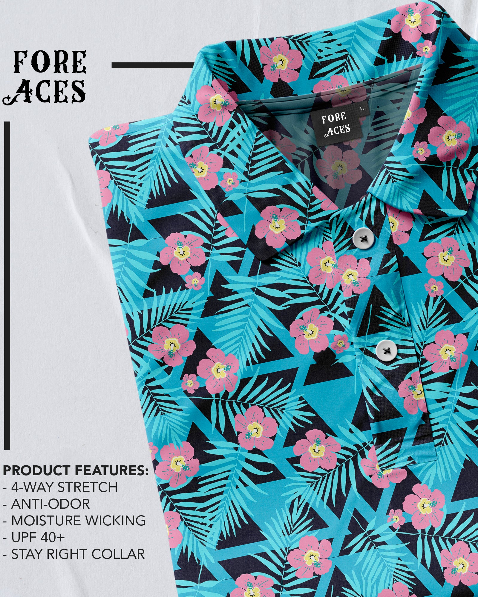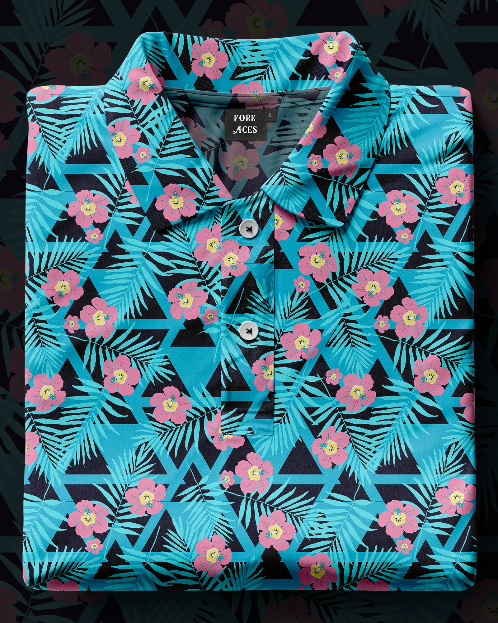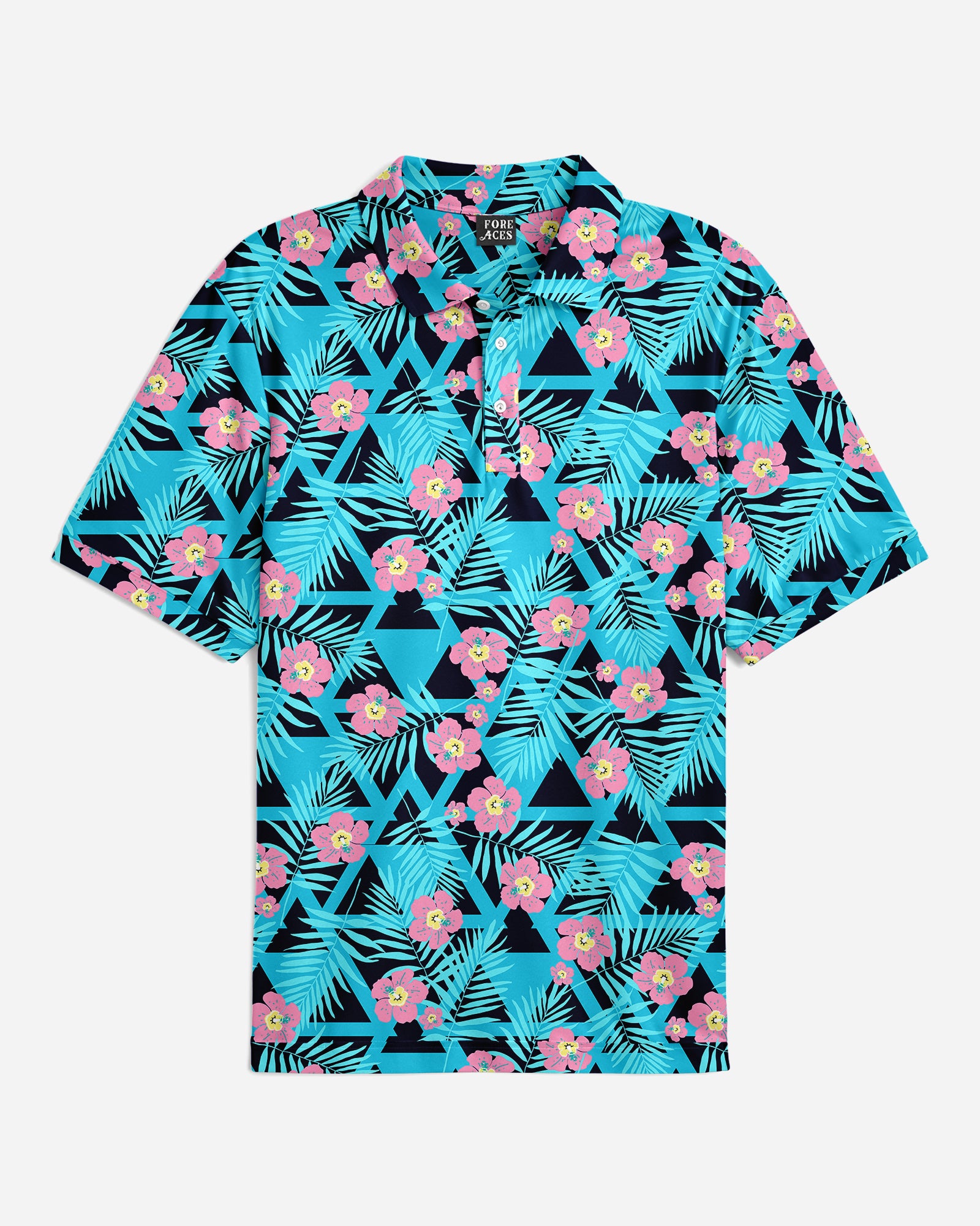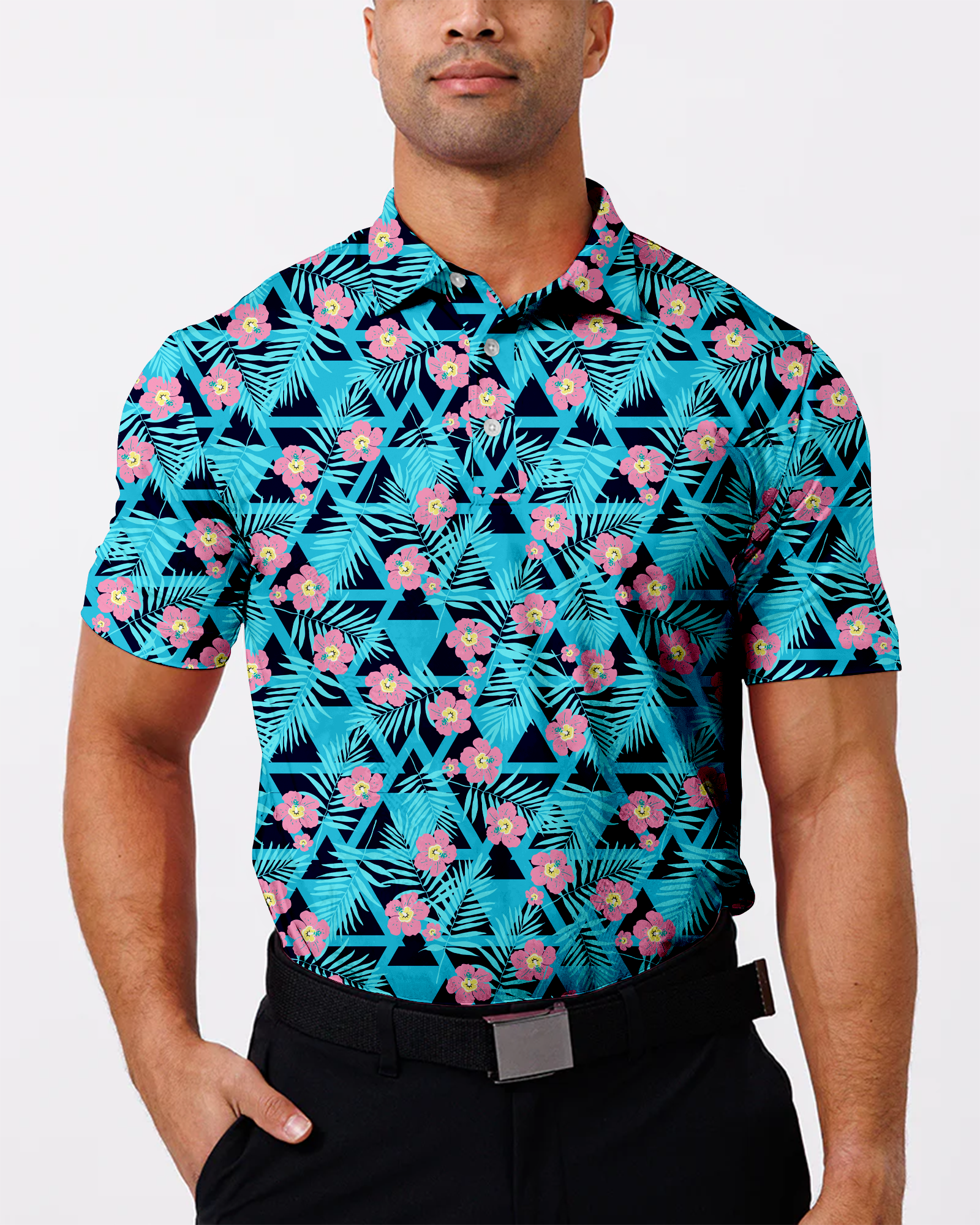 The Birdie Breeze Polo in sky blue features a vibrant pink floral print complemented by stylish triangular shapes, making it a perfect blend of elegance and modern design. Crafted from lightweight, breathable fabric, this polo ensures comfort and mobility, ideal for both casual outings and active days on the course. Its tailored fit and eye-catching pattern make it a versatile addition to any wardrobe, allowing you to express your unique style effortlessly.
