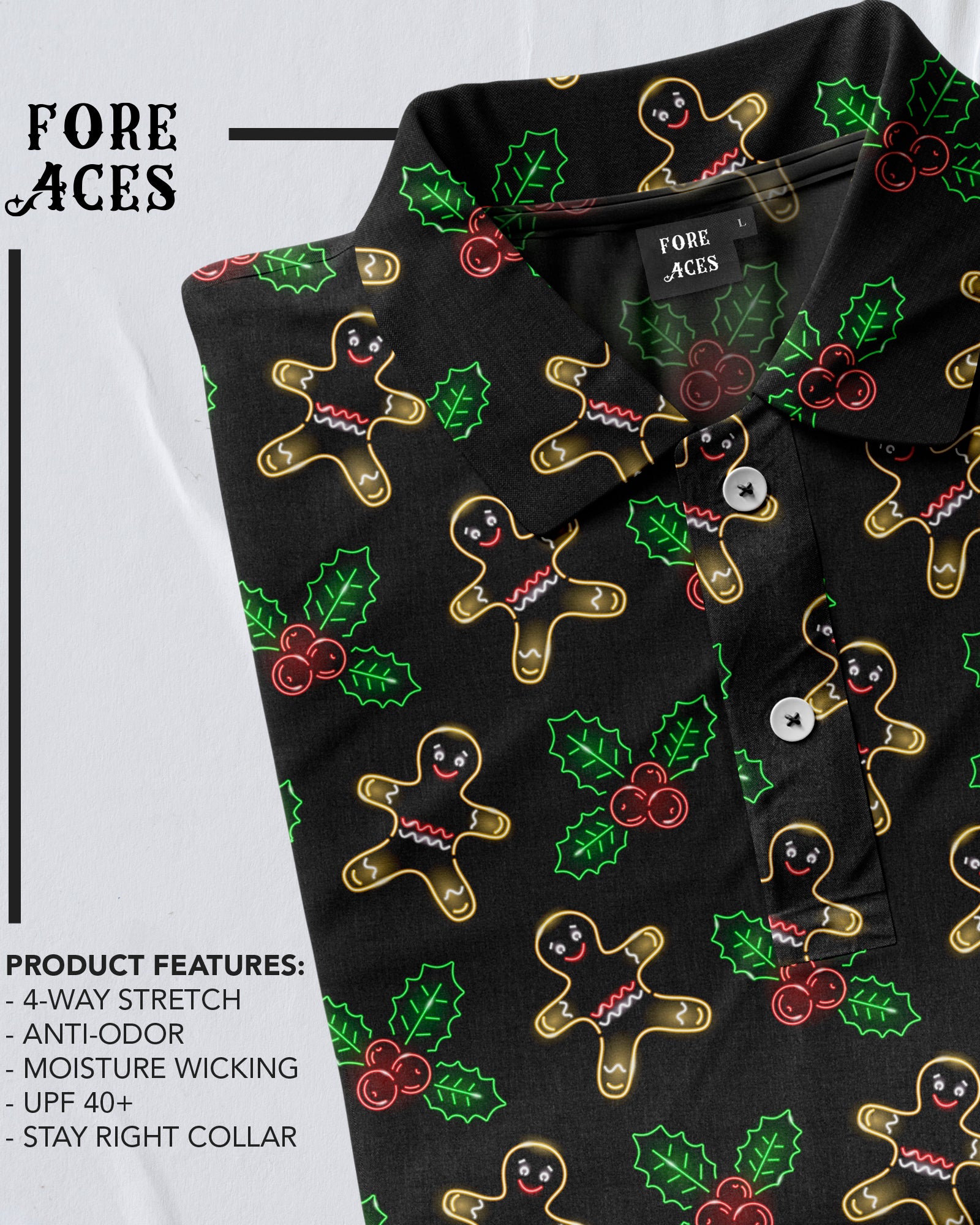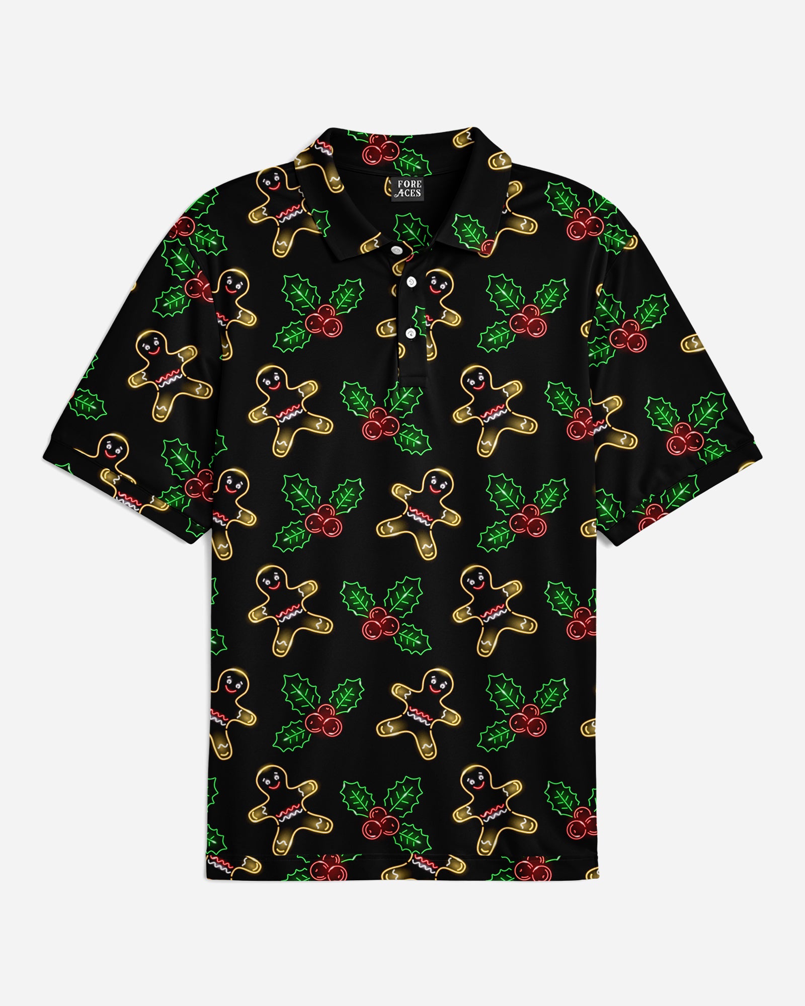 Get into the holiday spirit on the golf course with our Festive Cheer Polo! This fun and festive golf shirt features adorable Gingerbread Men and Holly Leaves to keep you stylish and spirited while you play. Don't let your golf game be a snooze-fest; add some cheer with this jolly polo