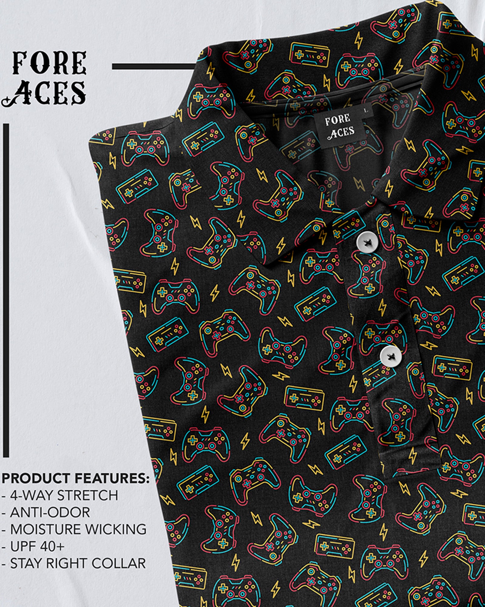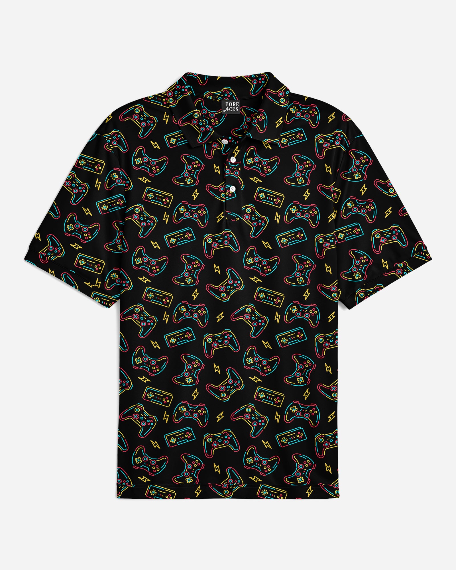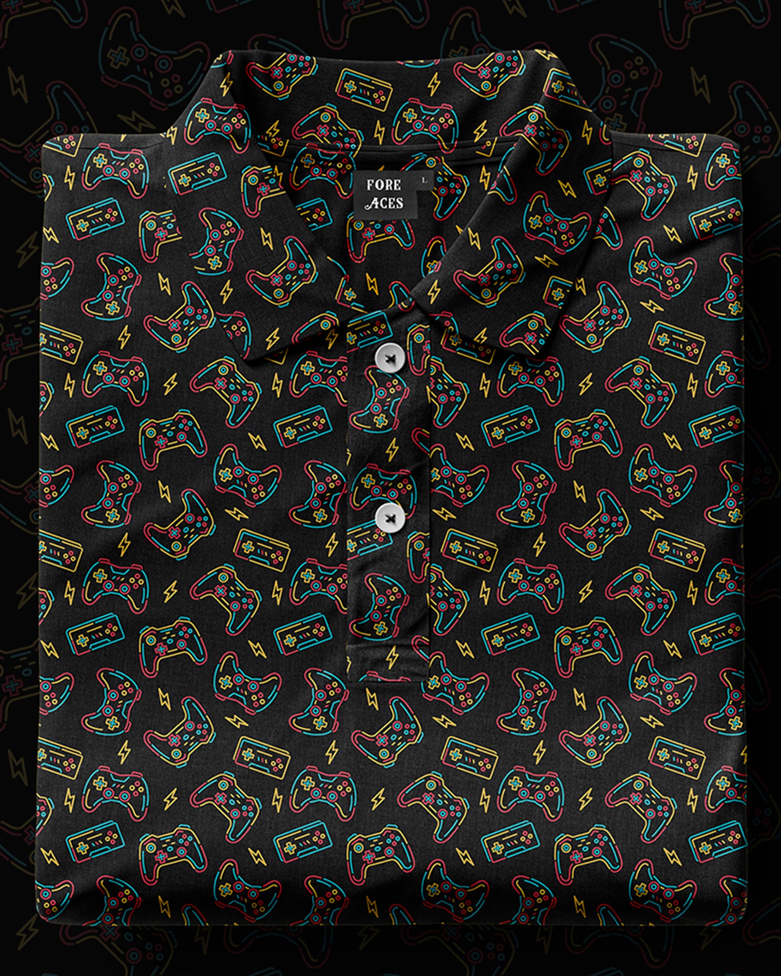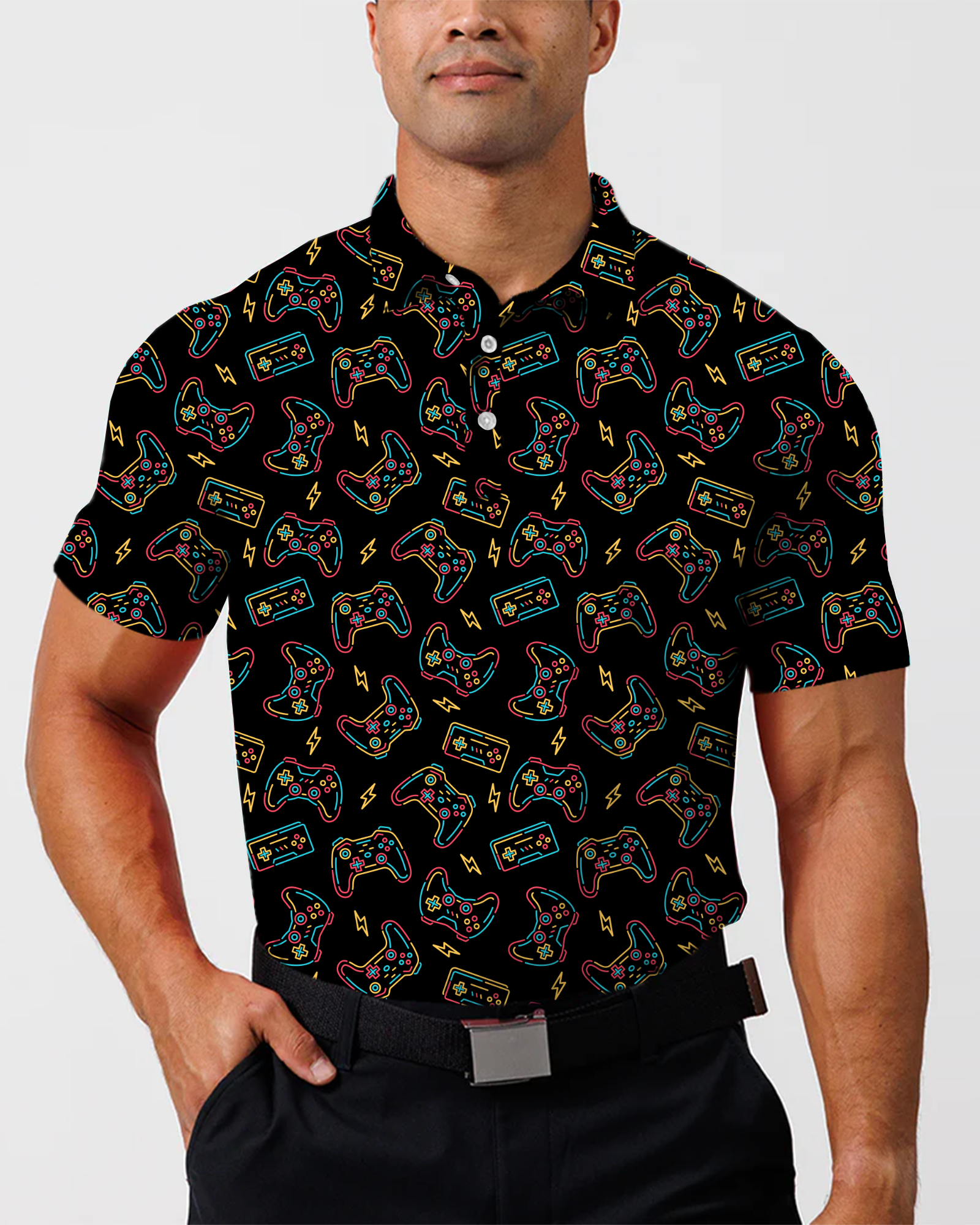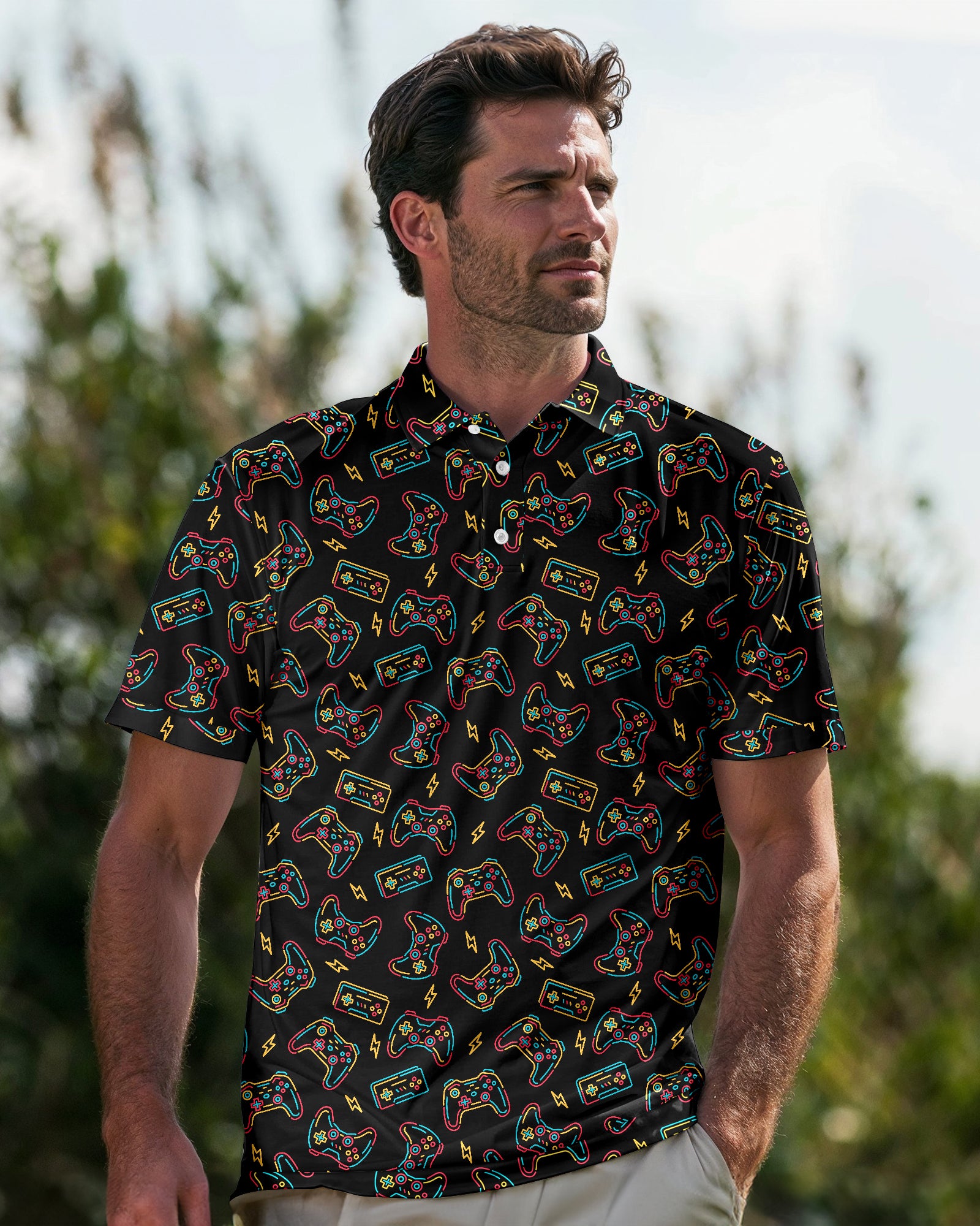 Gamer Polo, the perfect attire for all gaming enthusiasts. This sleek black polo features a vibrant design of colorful video game controllers, showcasing your passion for gaming. Crafted with comfort in mind, this shirt is made from high-quality materials to ensure a comfortable fit during those intense gaming sessions. Whether you're conquering virtual worlds or competing with friends at the course, our Gamer Polo is the ultimate choice for gamers who love to win and embrace all the fun that gaming has to offer.