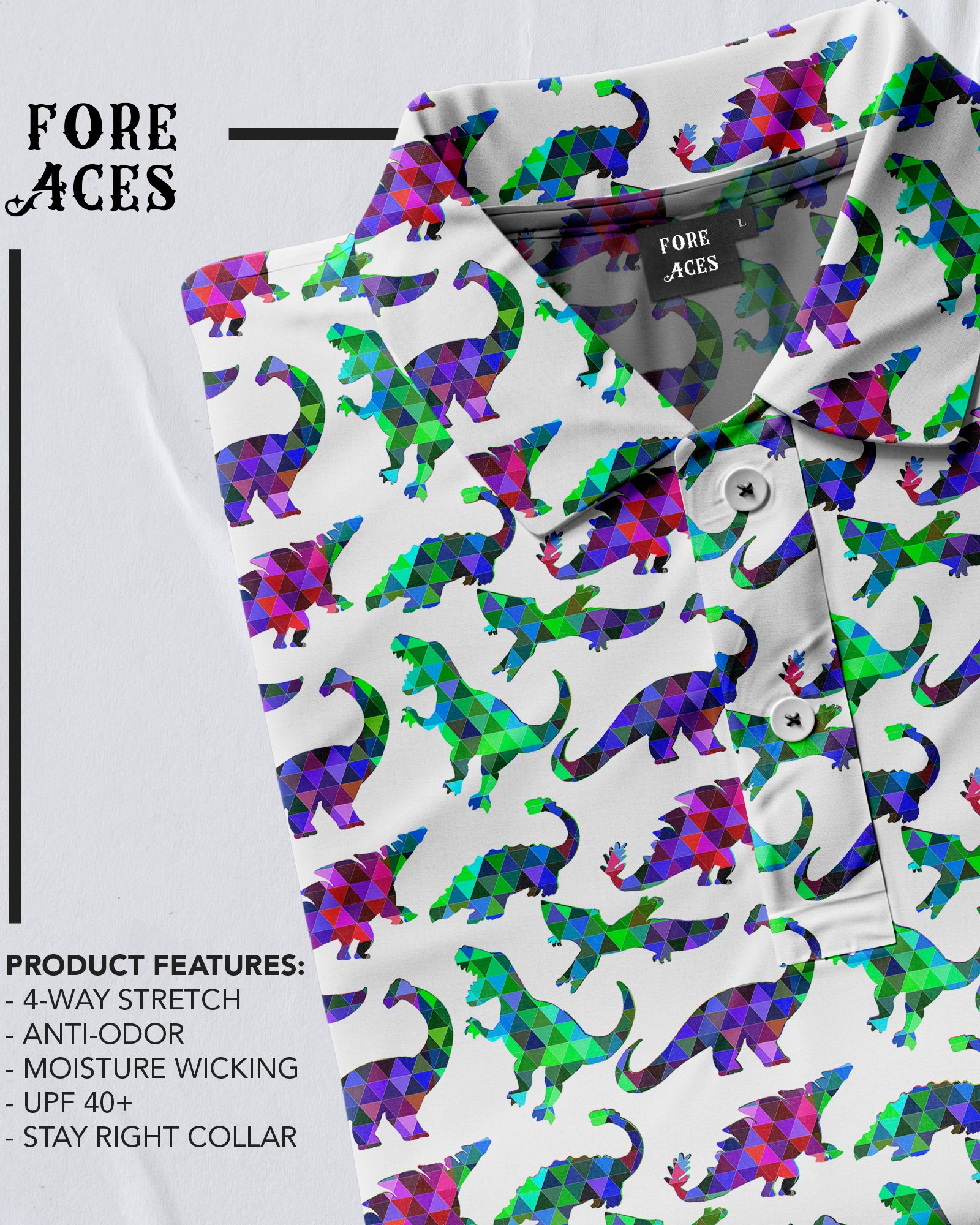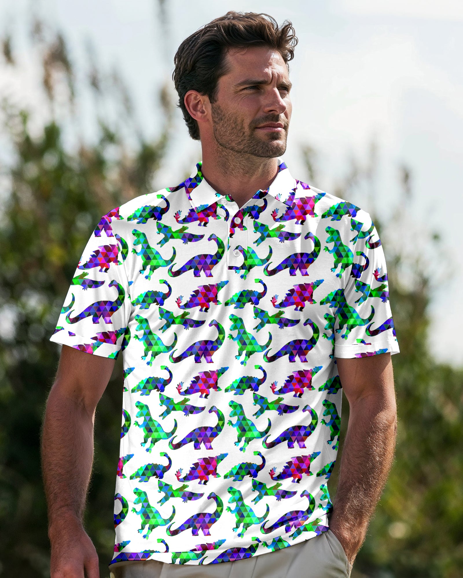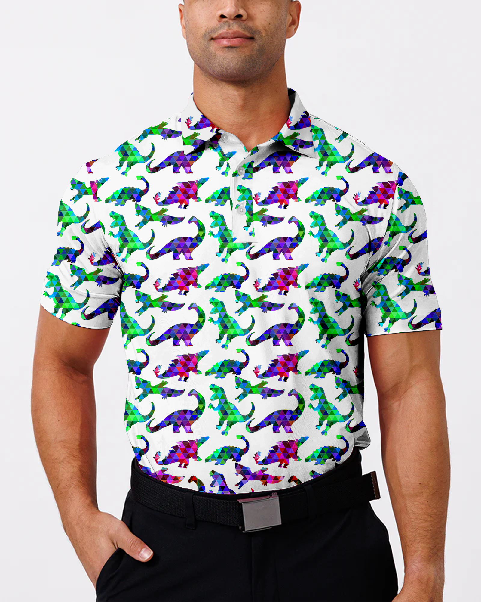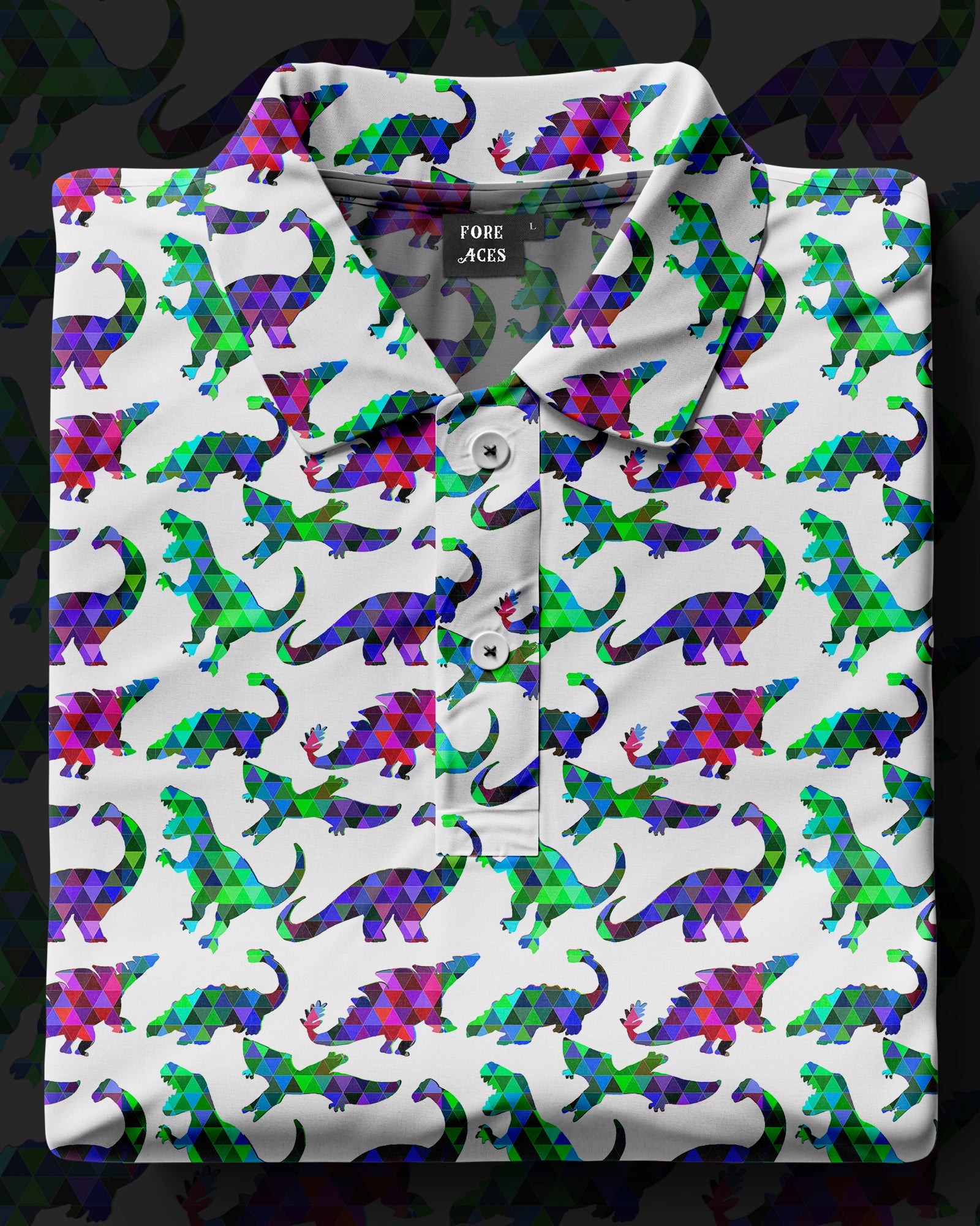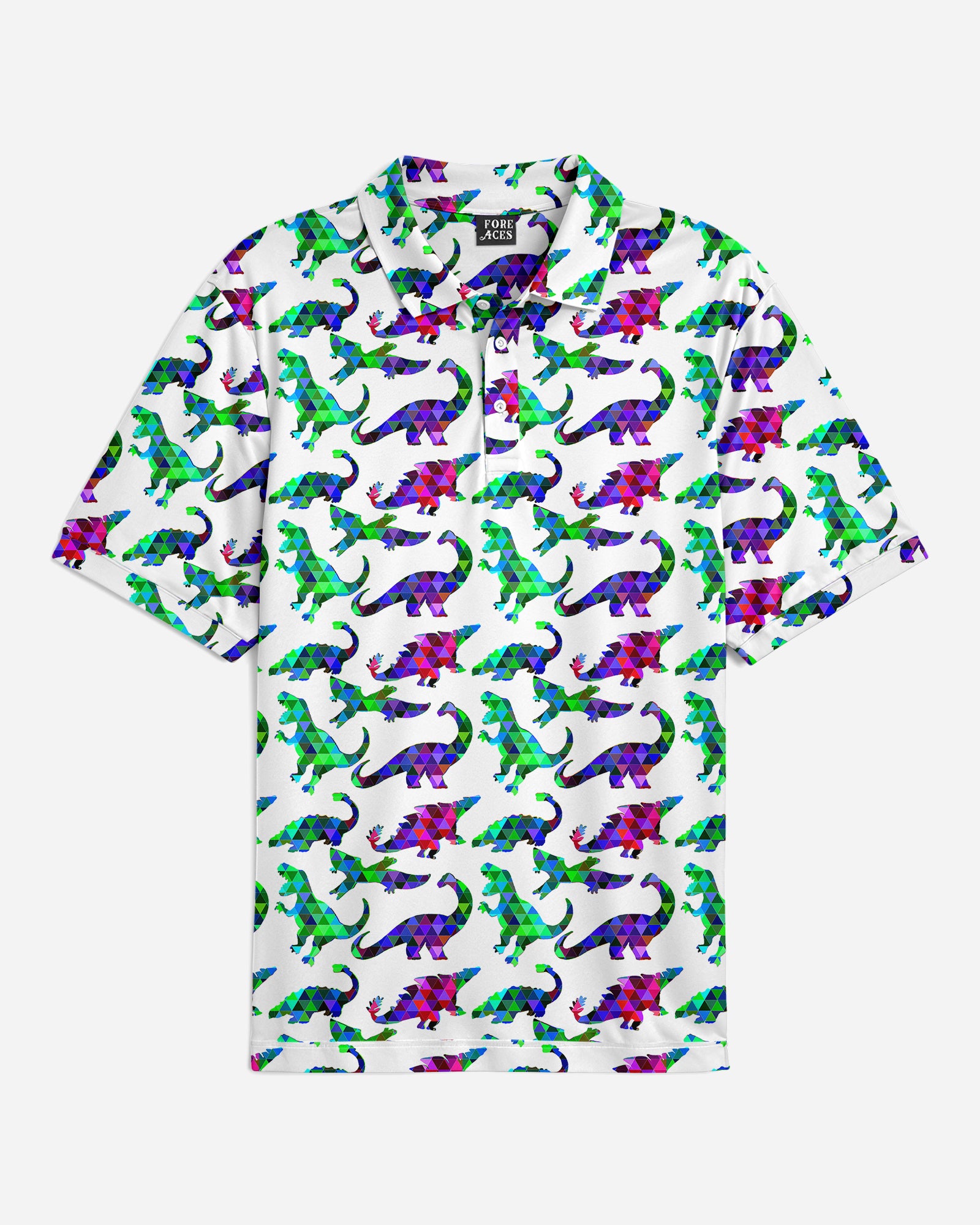 Introducing the Geometric Dino Polo golf shirt, a stylish and modern addition to your golf wardrobe. Made with high-quality materials, this polo features a unique geometric dinosaur pattern that will make you stand out on the course. The breathable fabric and comfortable fit make it perfect for a long day of golfing, while the eye-catching design adds a fun twist to your look. Whether you're hitting the links or grabbing drinks at the clubhouse, the Geometric Dino Polo is sure to make a statement.