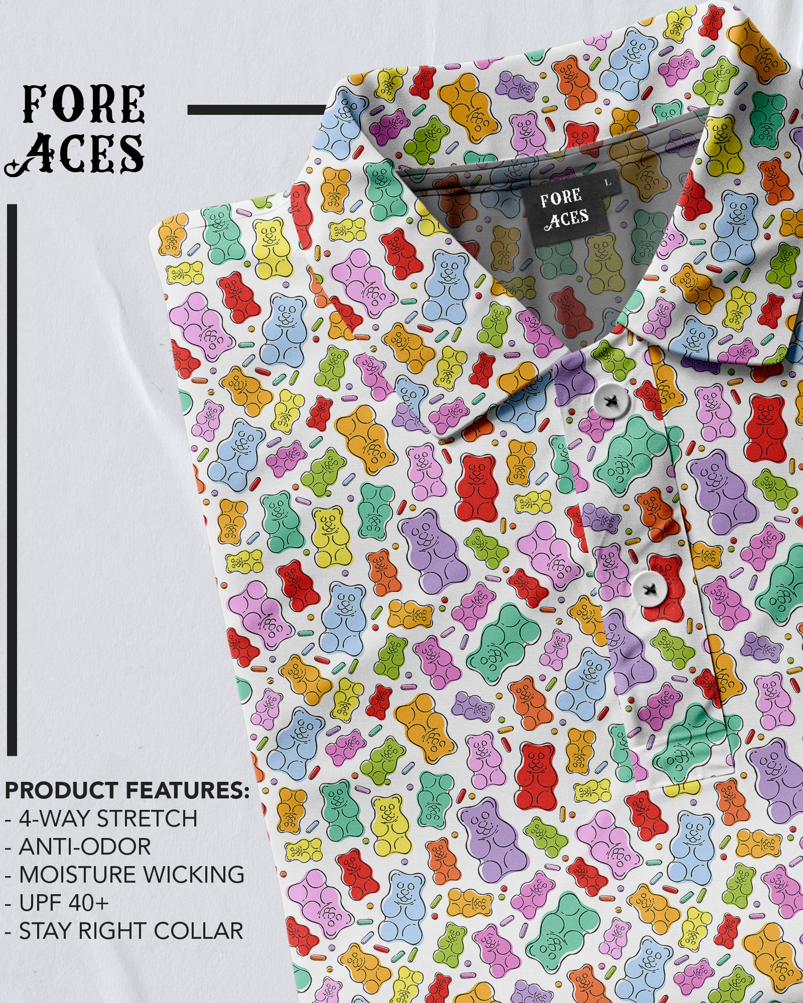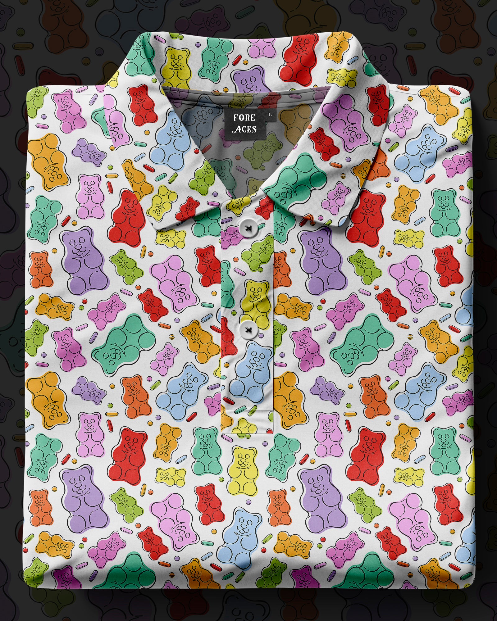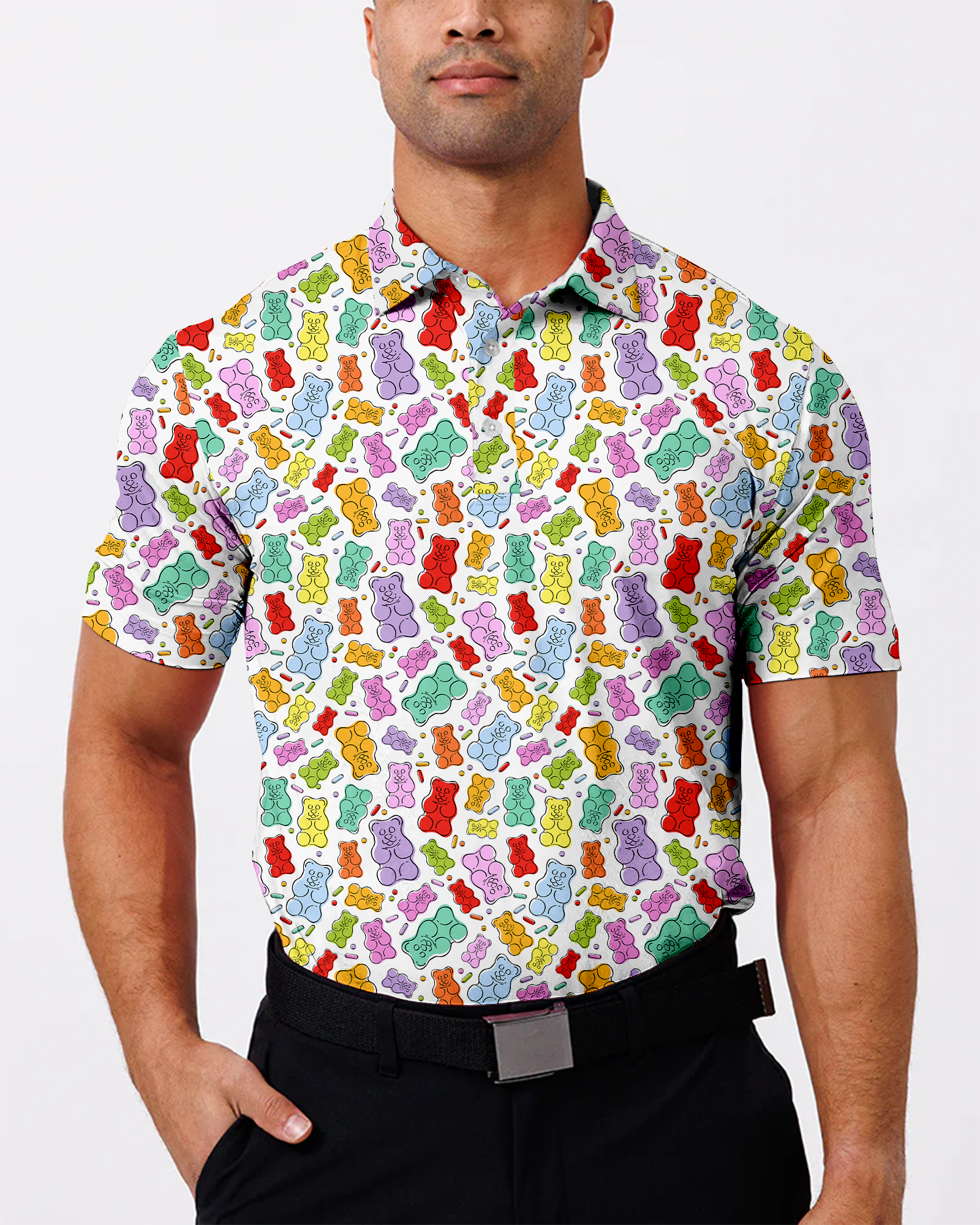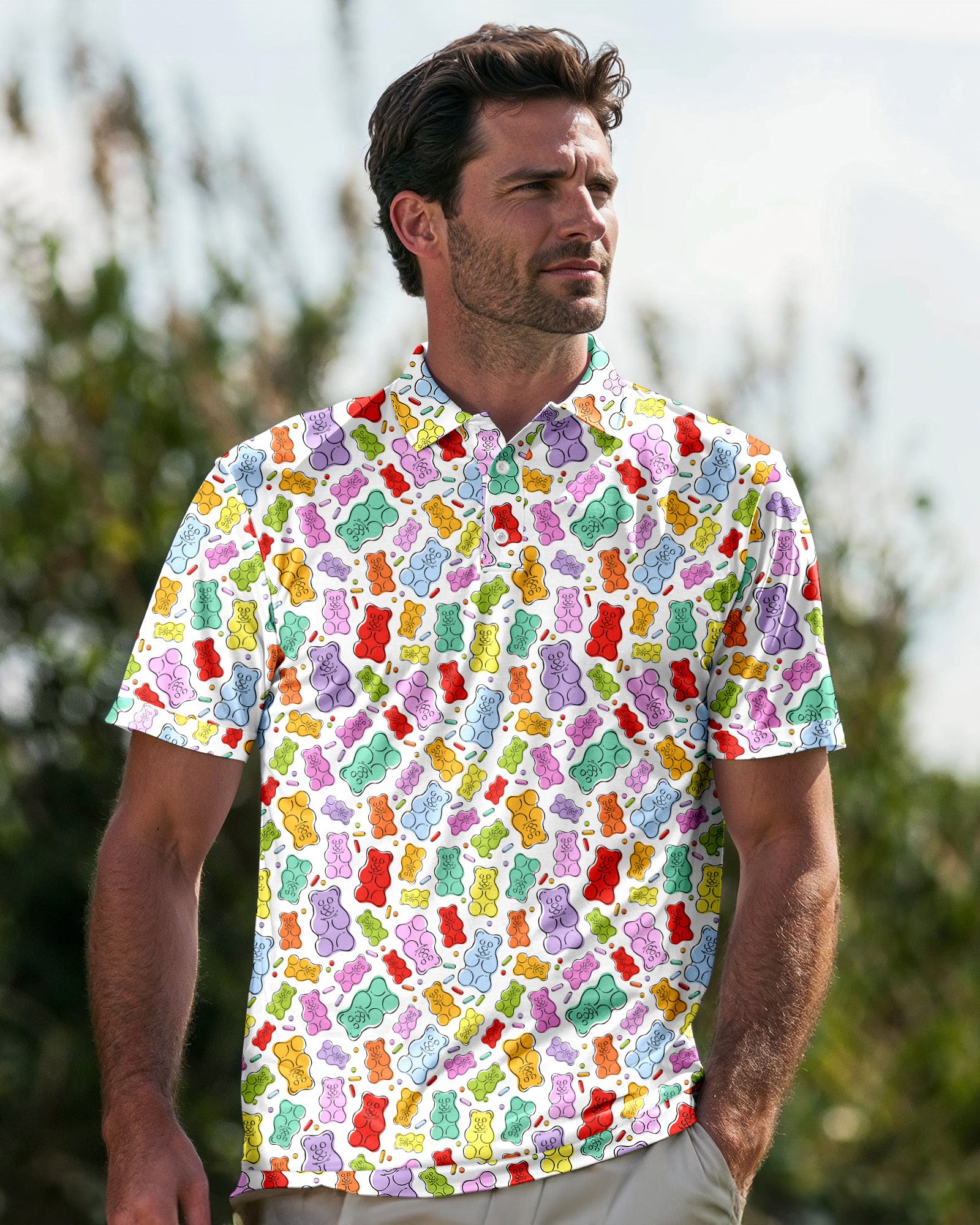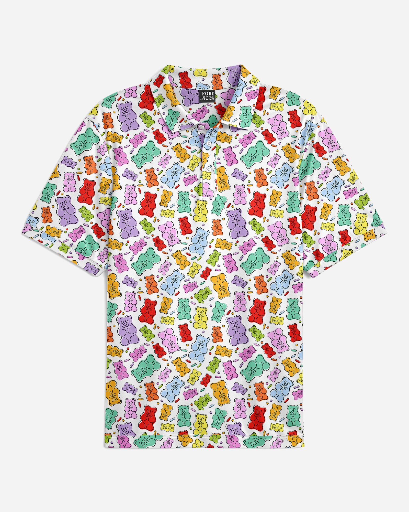 The Gummy Bears Polo is a fun and colorful shirt that features a cute gummy bear print all over. Made from soft and comfortable fabric, this polo is perfect for adding a playful touch to any outfit. With its vibrant design, it's sure to be a hit with anyone who loves gummy bears or just wants to add a pop of color to their wardrobe. Get ready to stand out in style with the Gummy Bears Polo!