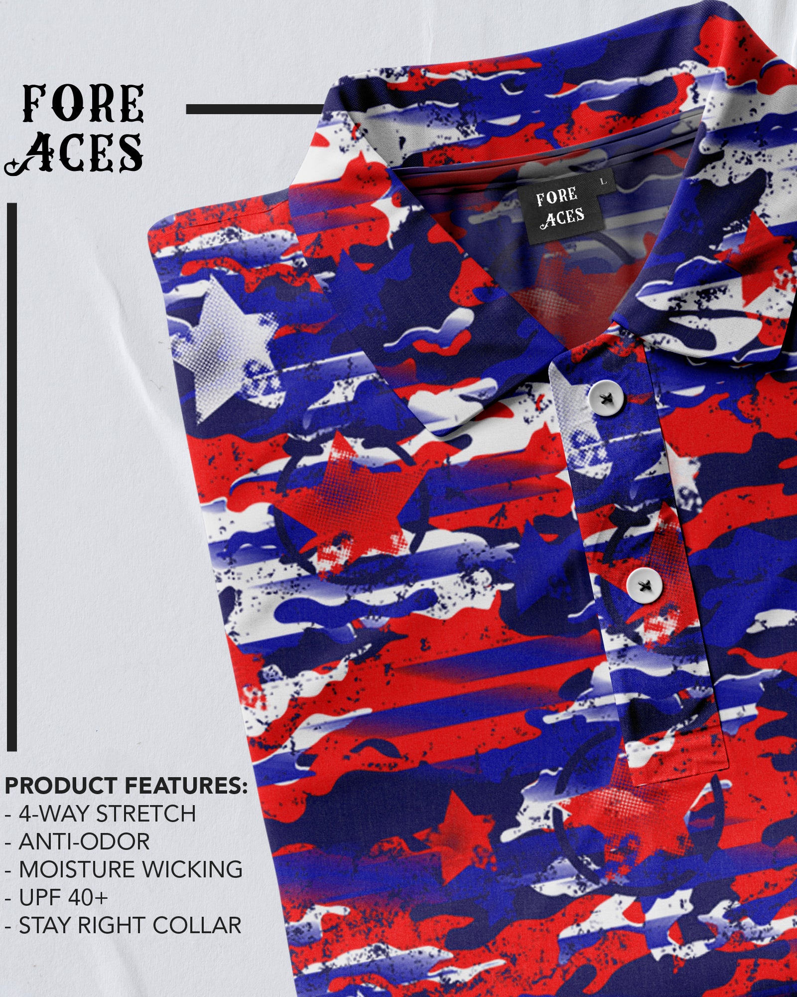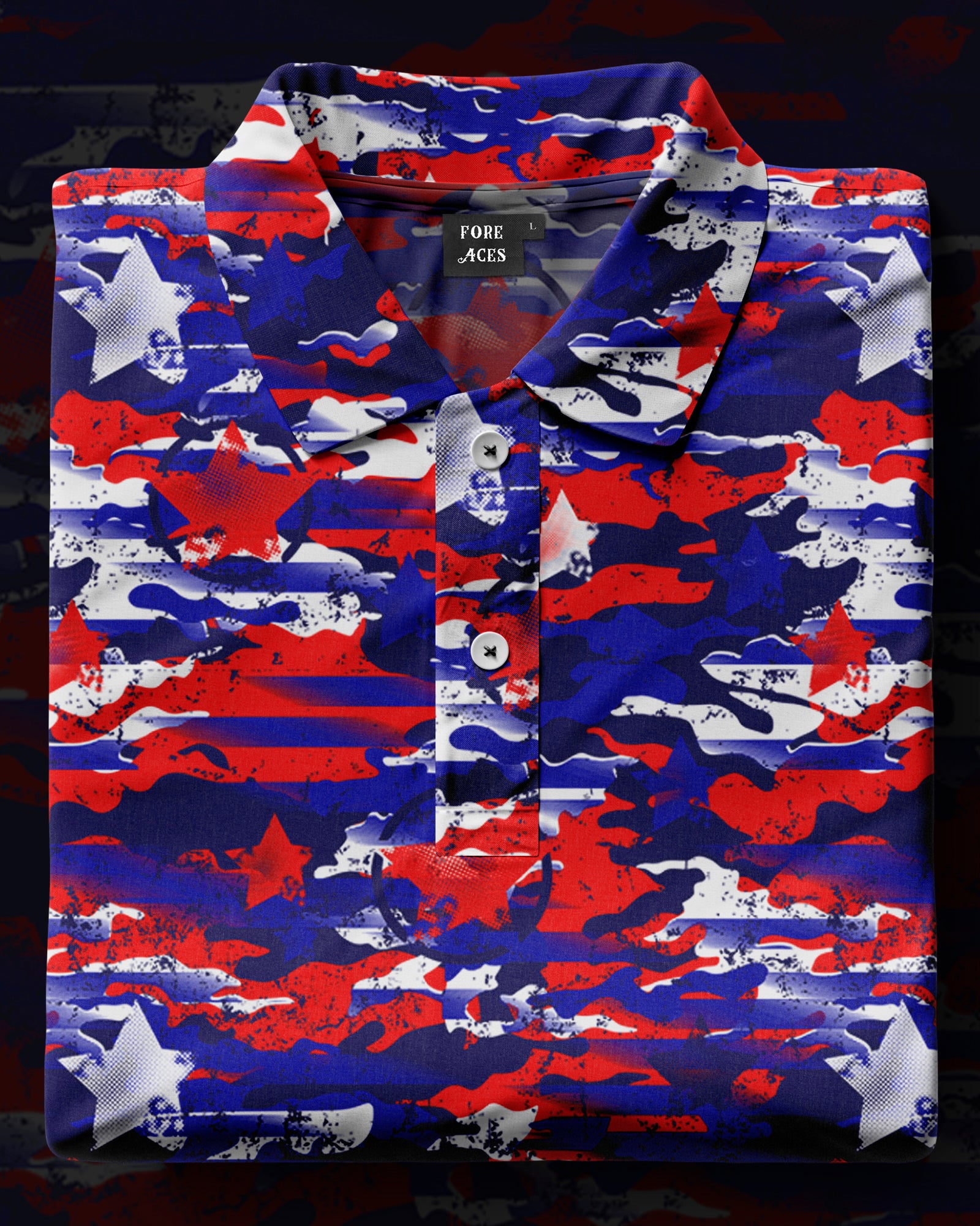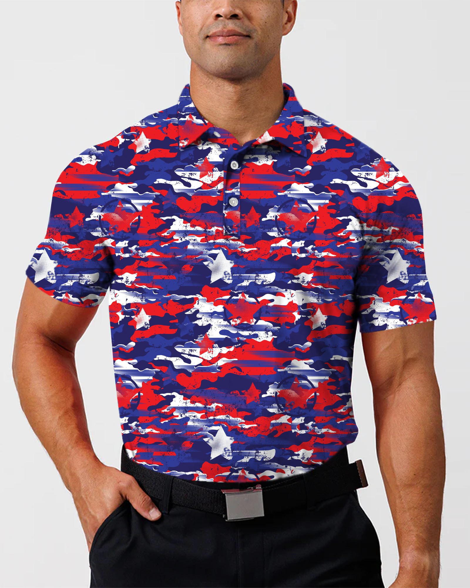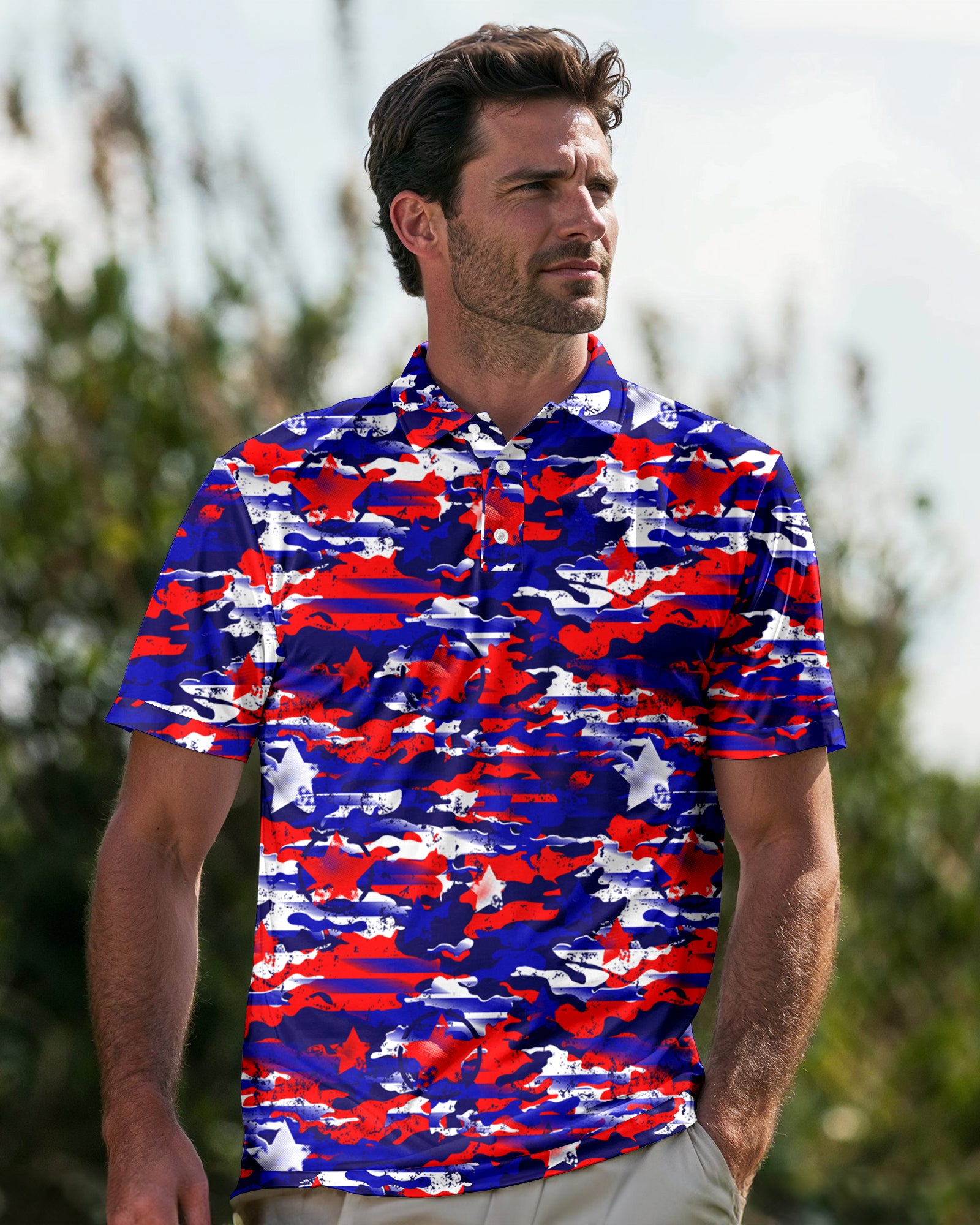 Patriotic Splash Camo Polo, a perfect blend of style and patriotism. This eye-catching polo shirt features a unique red, white, and blue camo pattern that exudes a sense of pride and love for your country. Crafted with utmost care, this shirt is made from high-quality materials to ensure comfort and durability. Whether you're attending a casual gathering or showing your support during national events, this polo is designed to make a statement. Embrace your patriotic spirit with our Patriotic Splash Camo Polo and stand out from the crowd with pride.