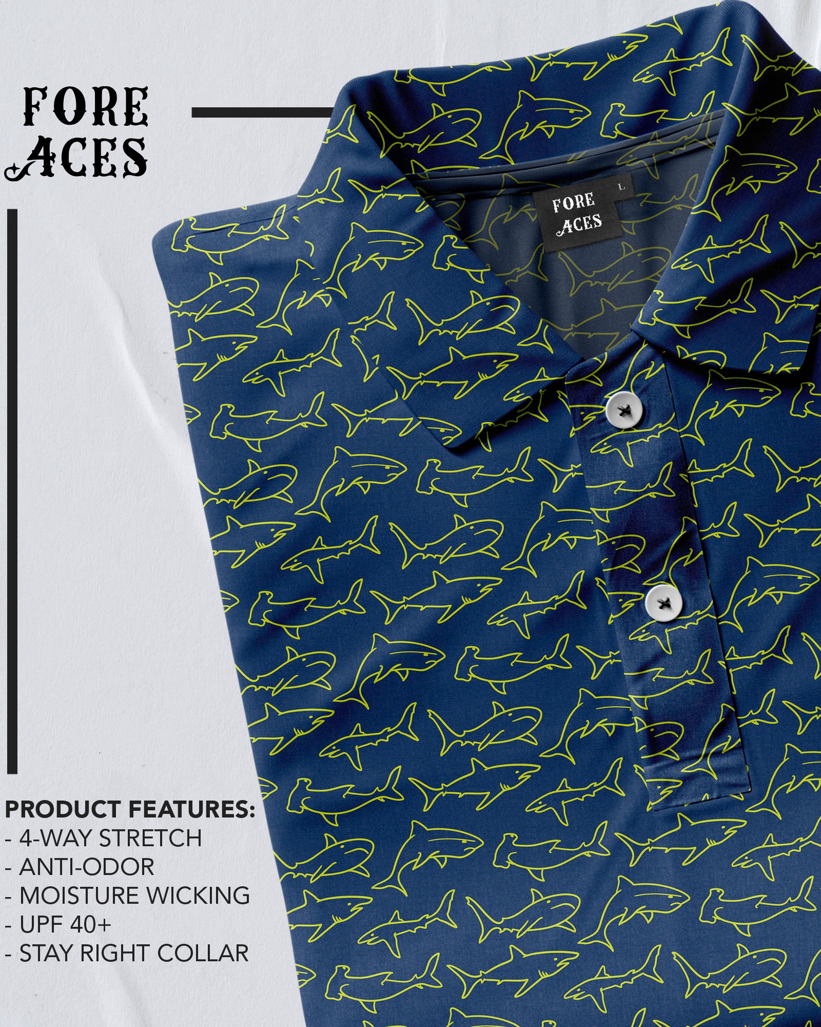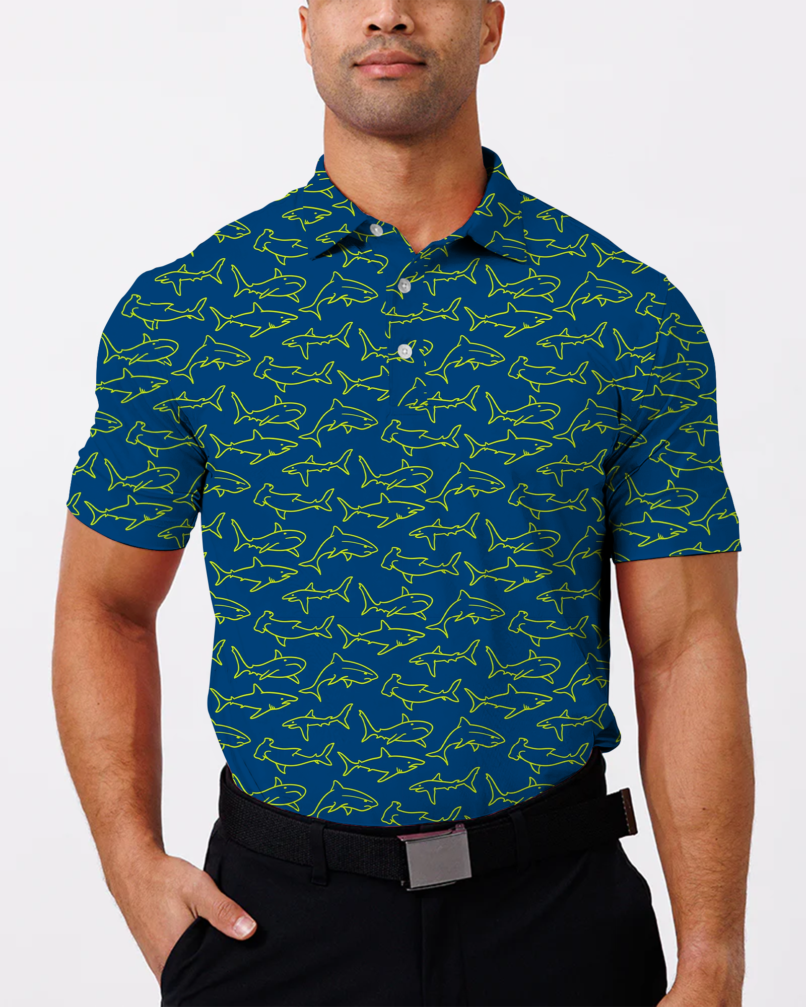 Introducing the Shark Tales Polo golf shirt, a stylish and functional addition to your golfing wardrobe. Crafted with premium materials, this polo offers a comfortable fit and excellent breathability, ensuring you stay cool and dry on the course. The sleek design features a shark-inspired pattern, adding a touch of uniqueness to your look. With its durable construction and timeless style, the Shark Tales Polo golf shirt is a must-have for any golfer looking to make a statement on and off the green.