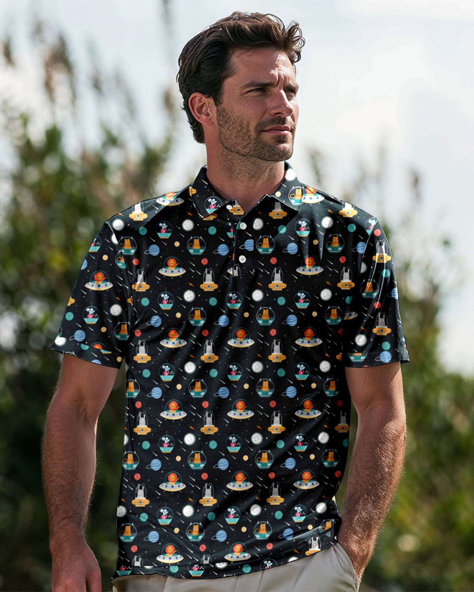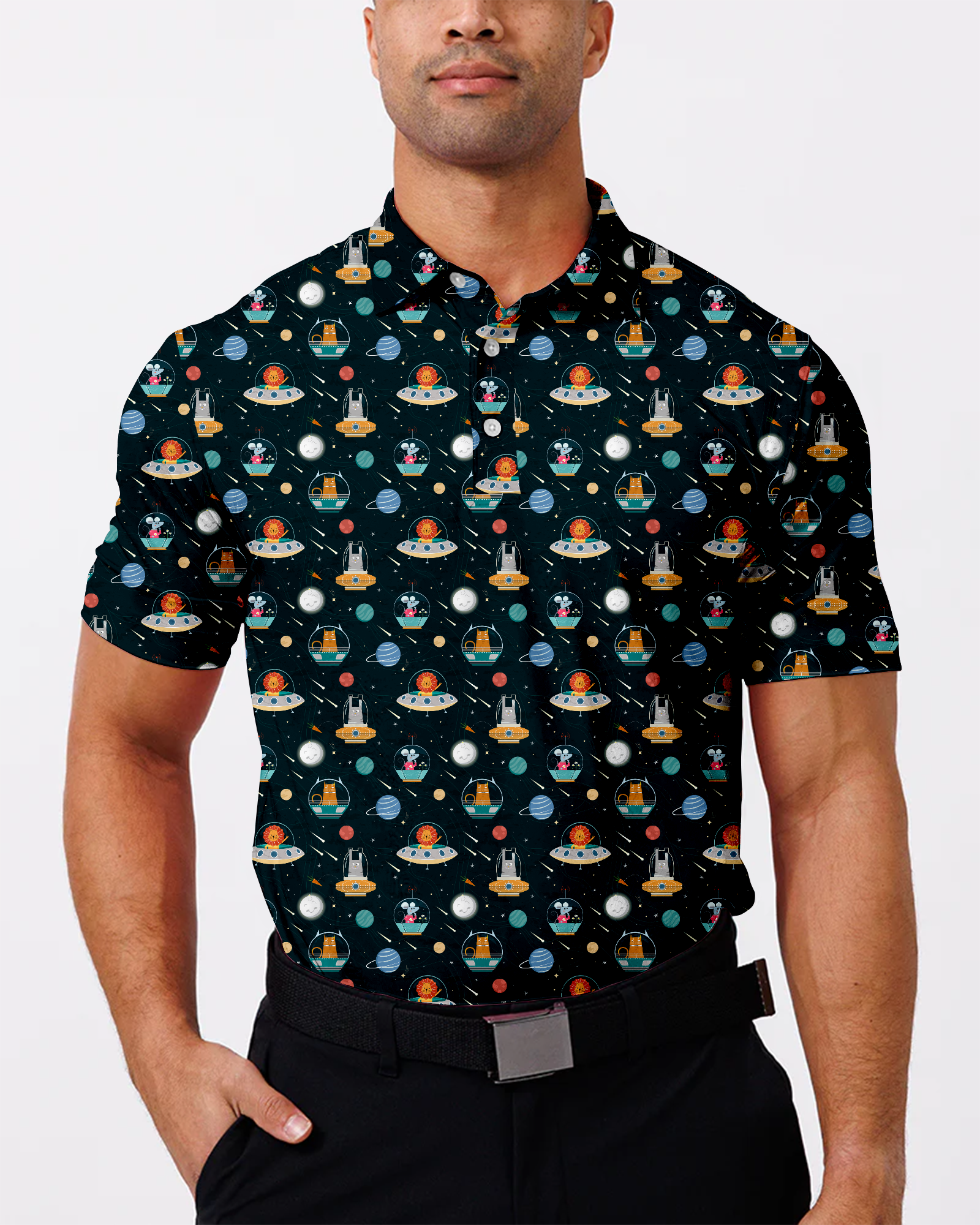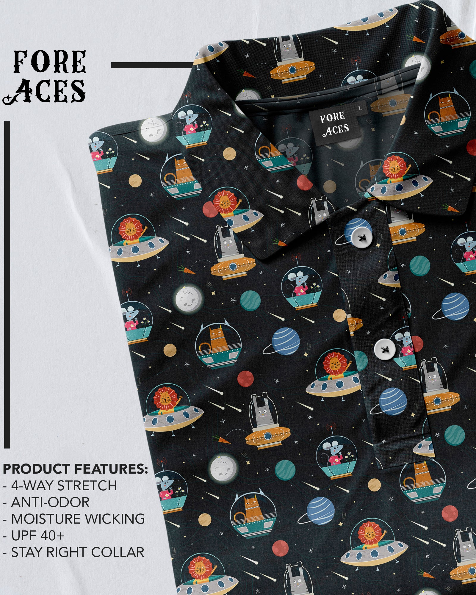 Introducing our Space Friends Polo, featuring adorable cat, rabbit, lion, and mouse astronauts cruising in their spaceships across the golf course. Made with high-quality fabric, this polo is not only stylish but also comfortable to wear. Show off your love for space and animals with this unique and fun polo shirt. Perfect for casual outings or a day on the green, this polo is a must-have for any animal and space enthusiast.