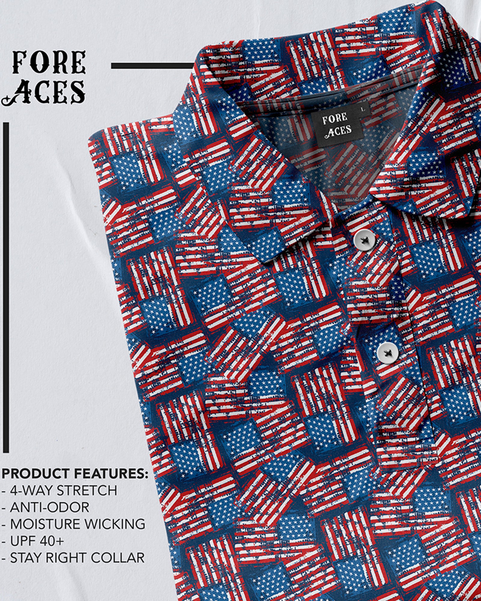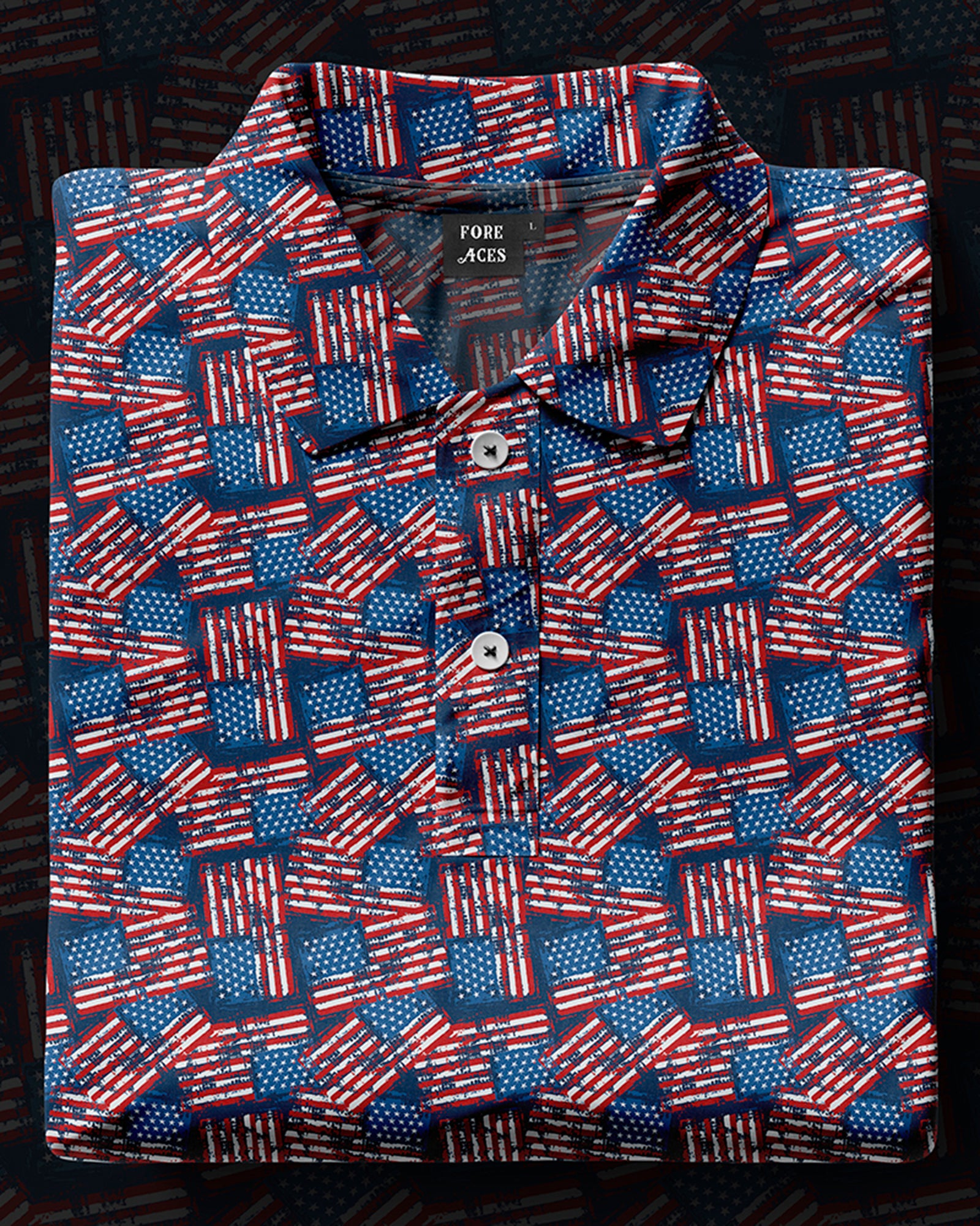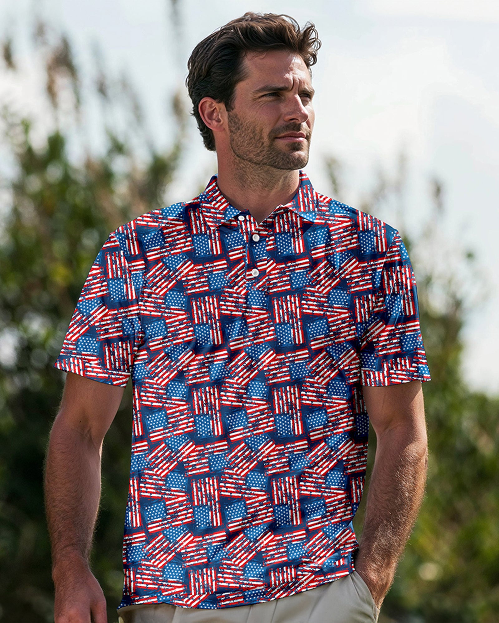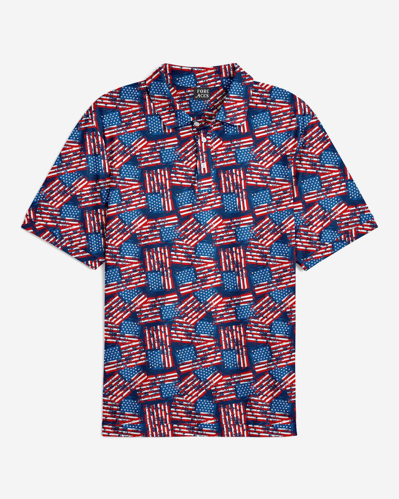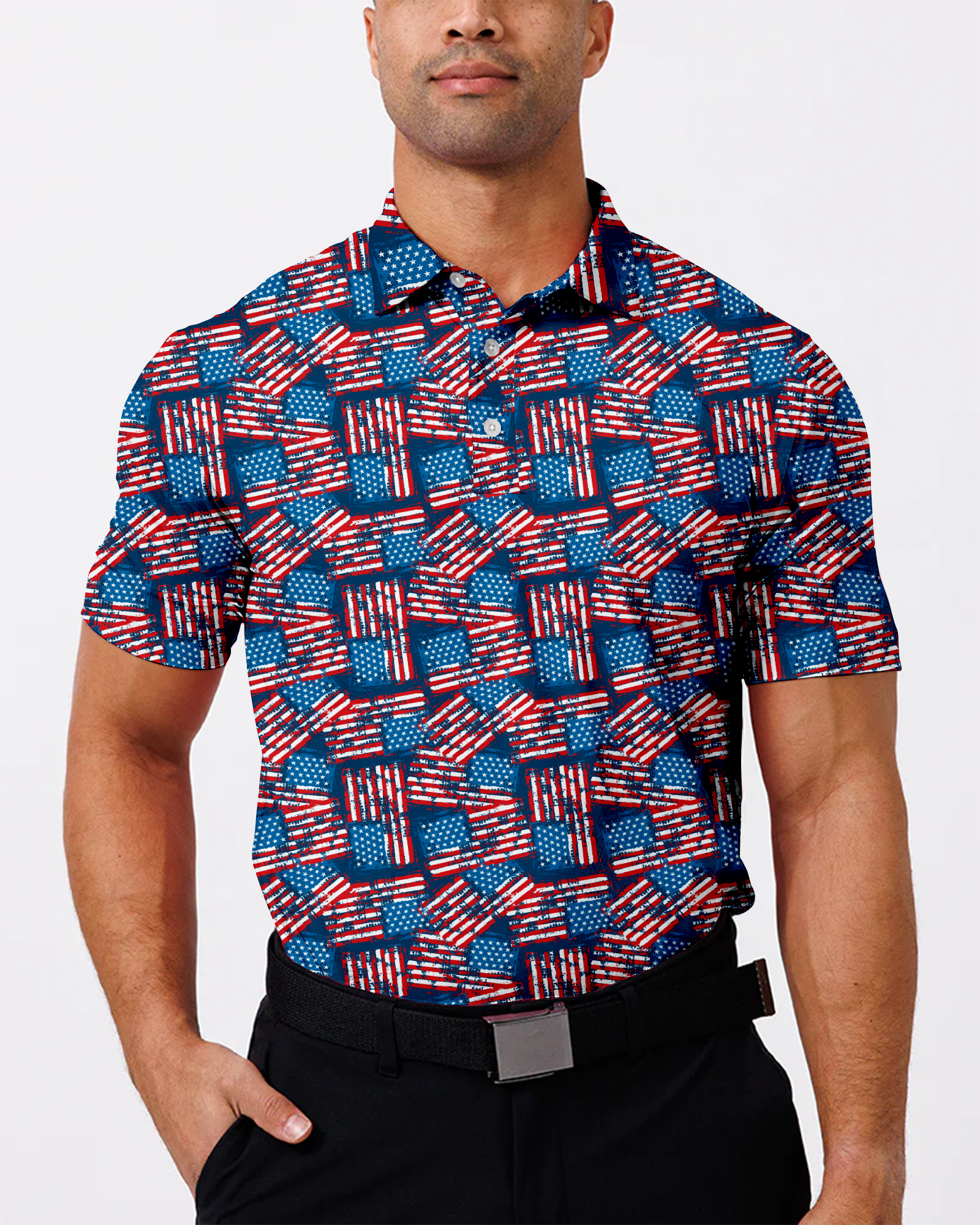 Introducing the "Star-Spangled Polo" –  a stylish design that's perfect for any casual occasion or golf course outing. This polo features a vibrant American flag design