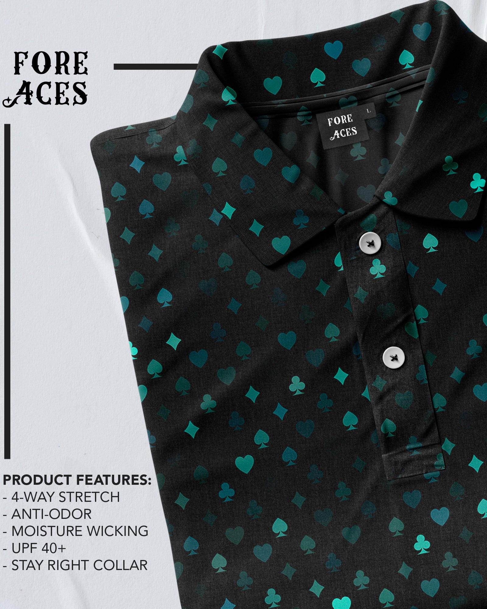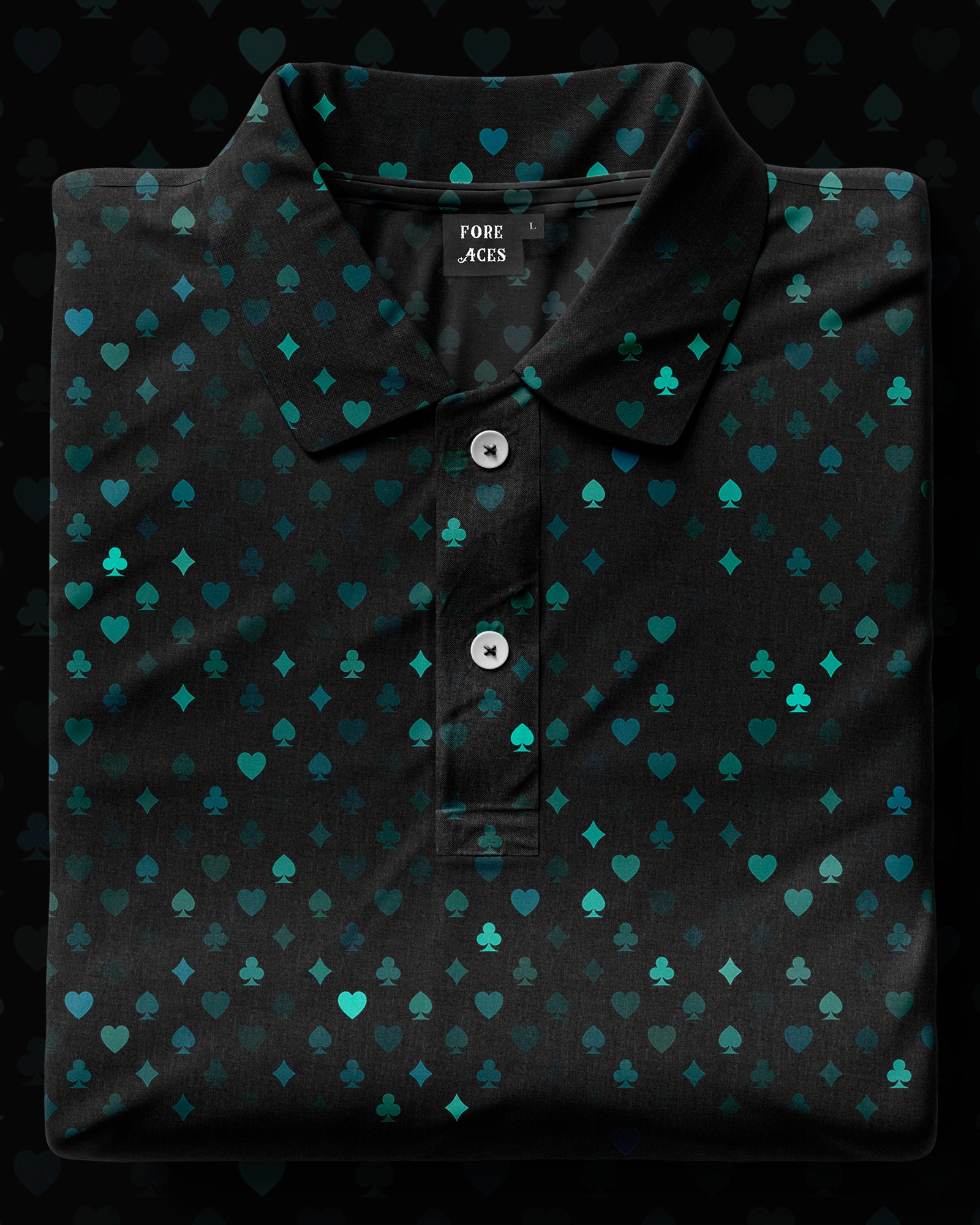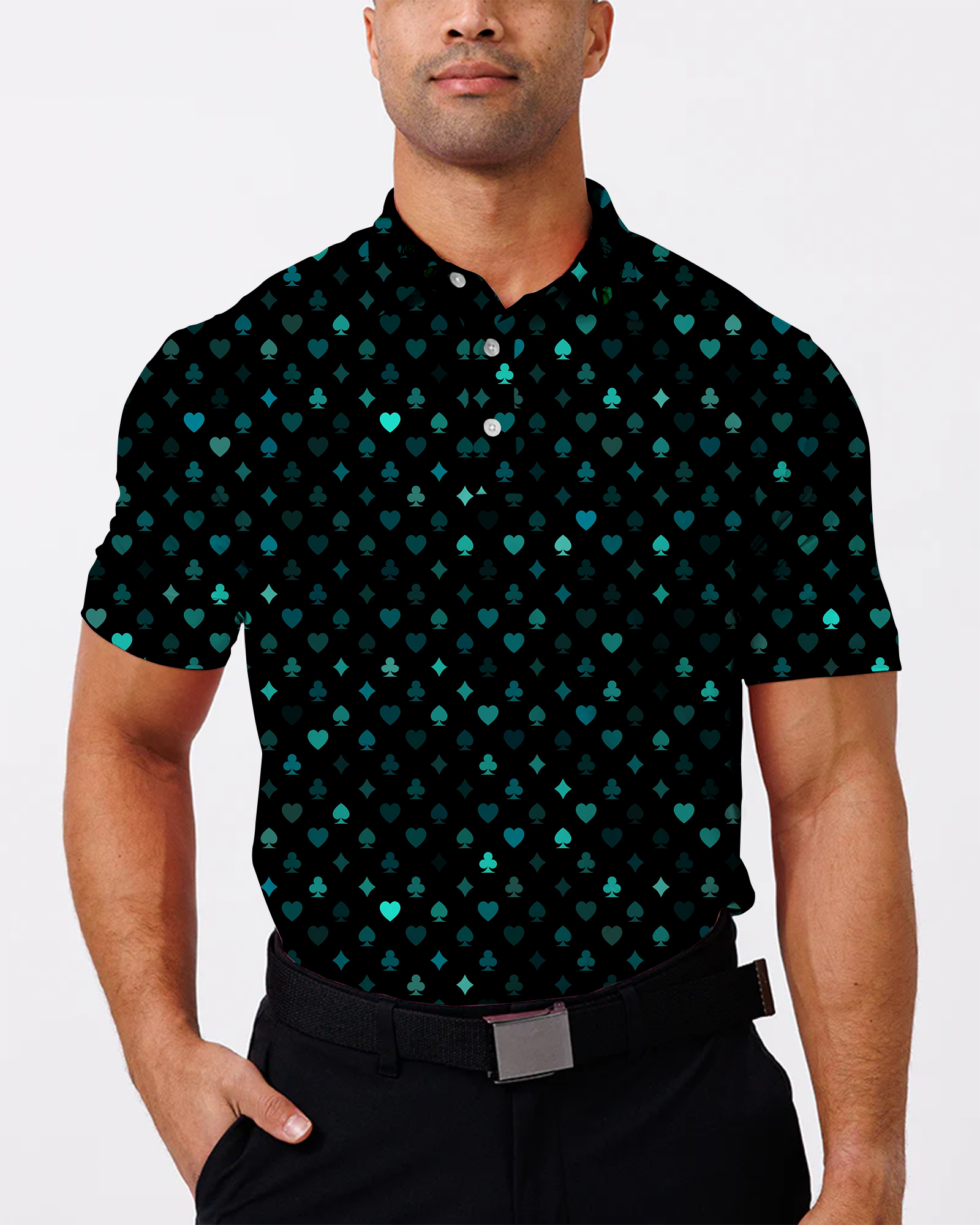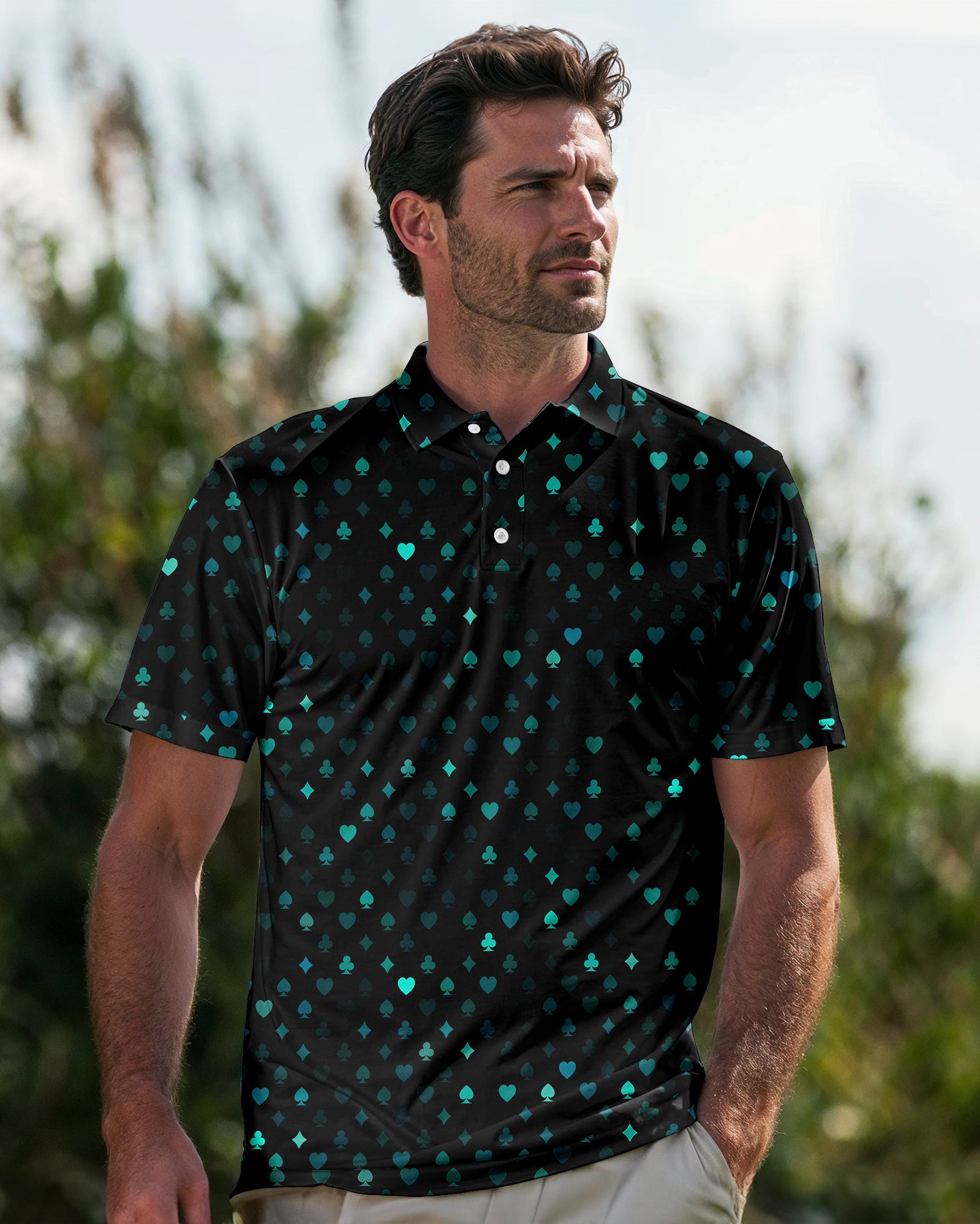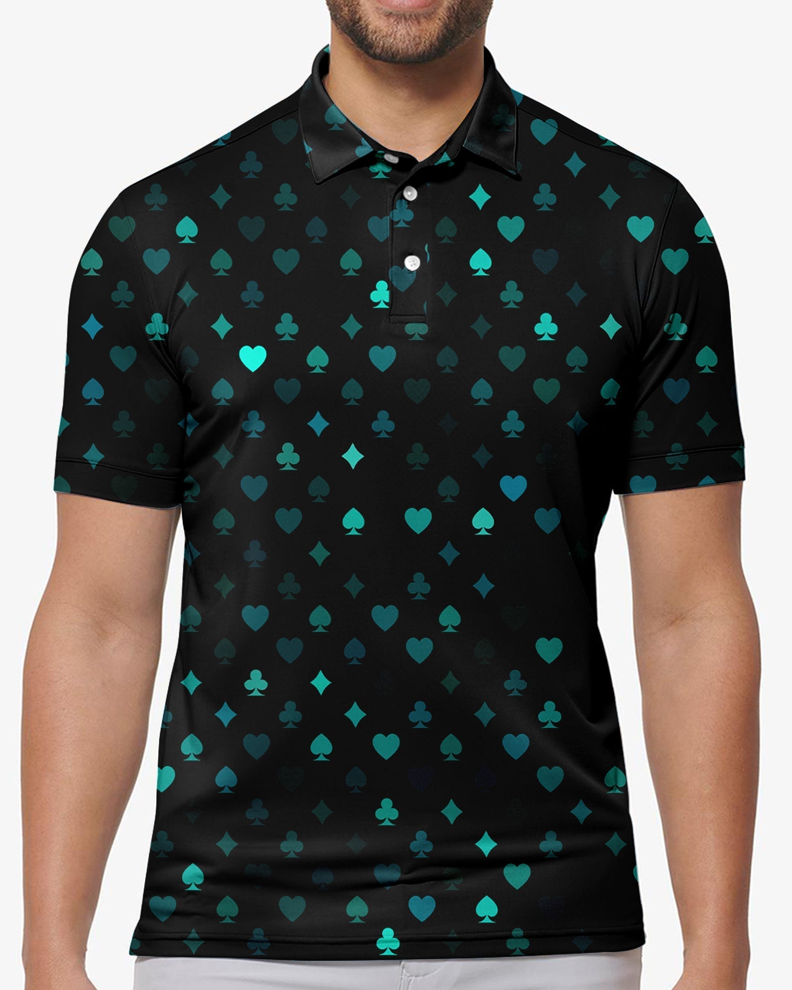 Step onto the fairways like a high roller in our 'Suited Up Polo.' With card suits on your chest, you'll have luck on your side and the competition wondering if you're playing golf or holding a royal flush.