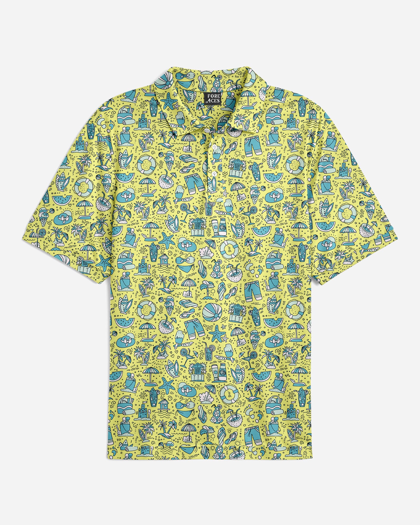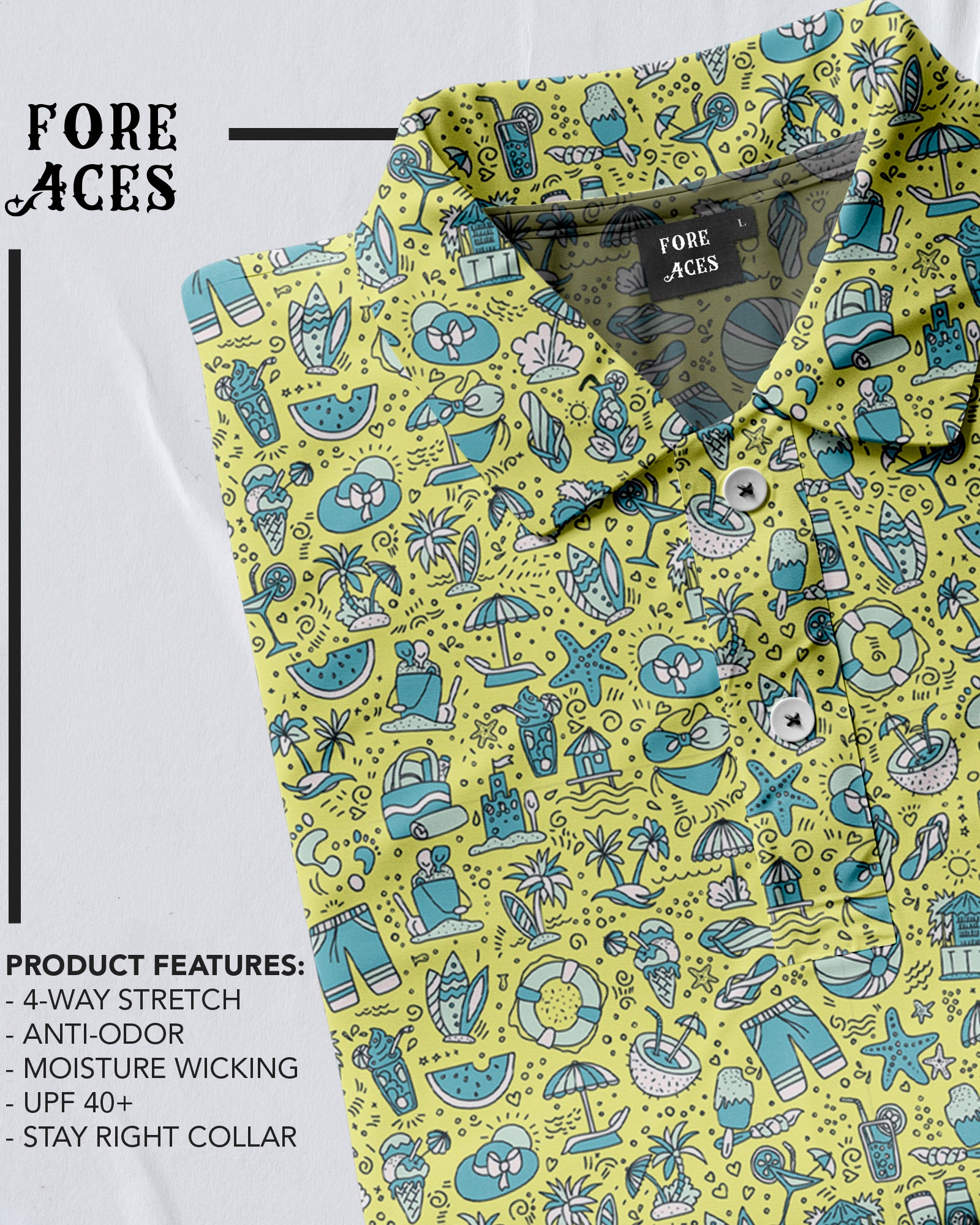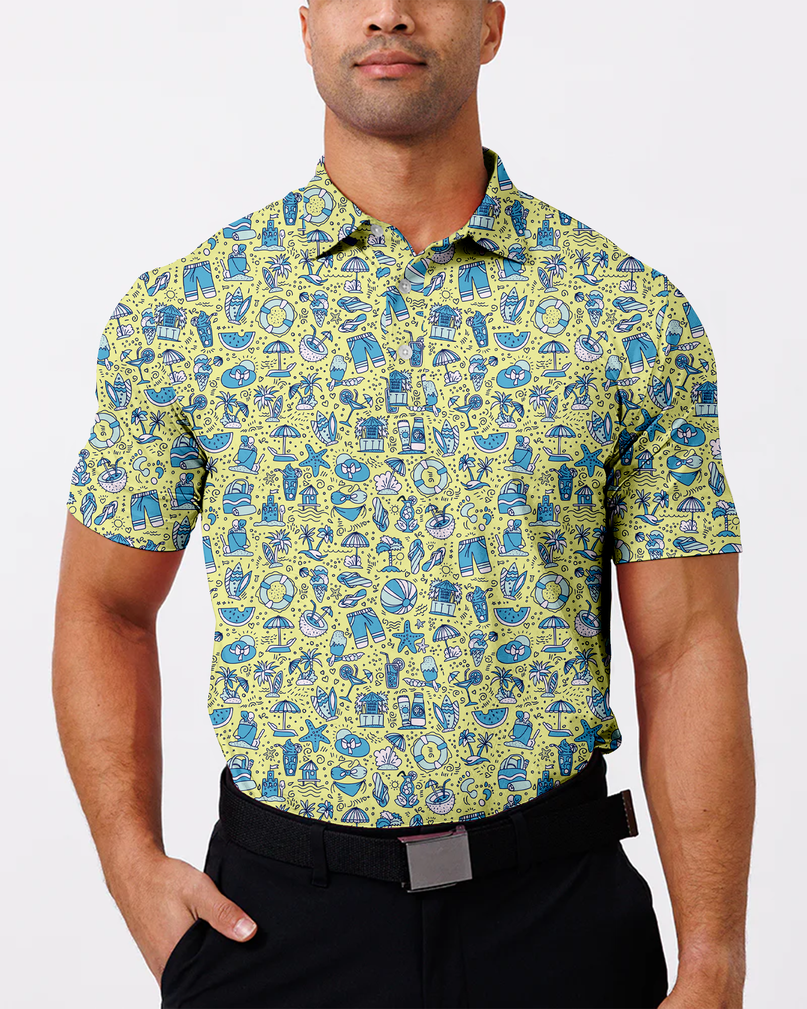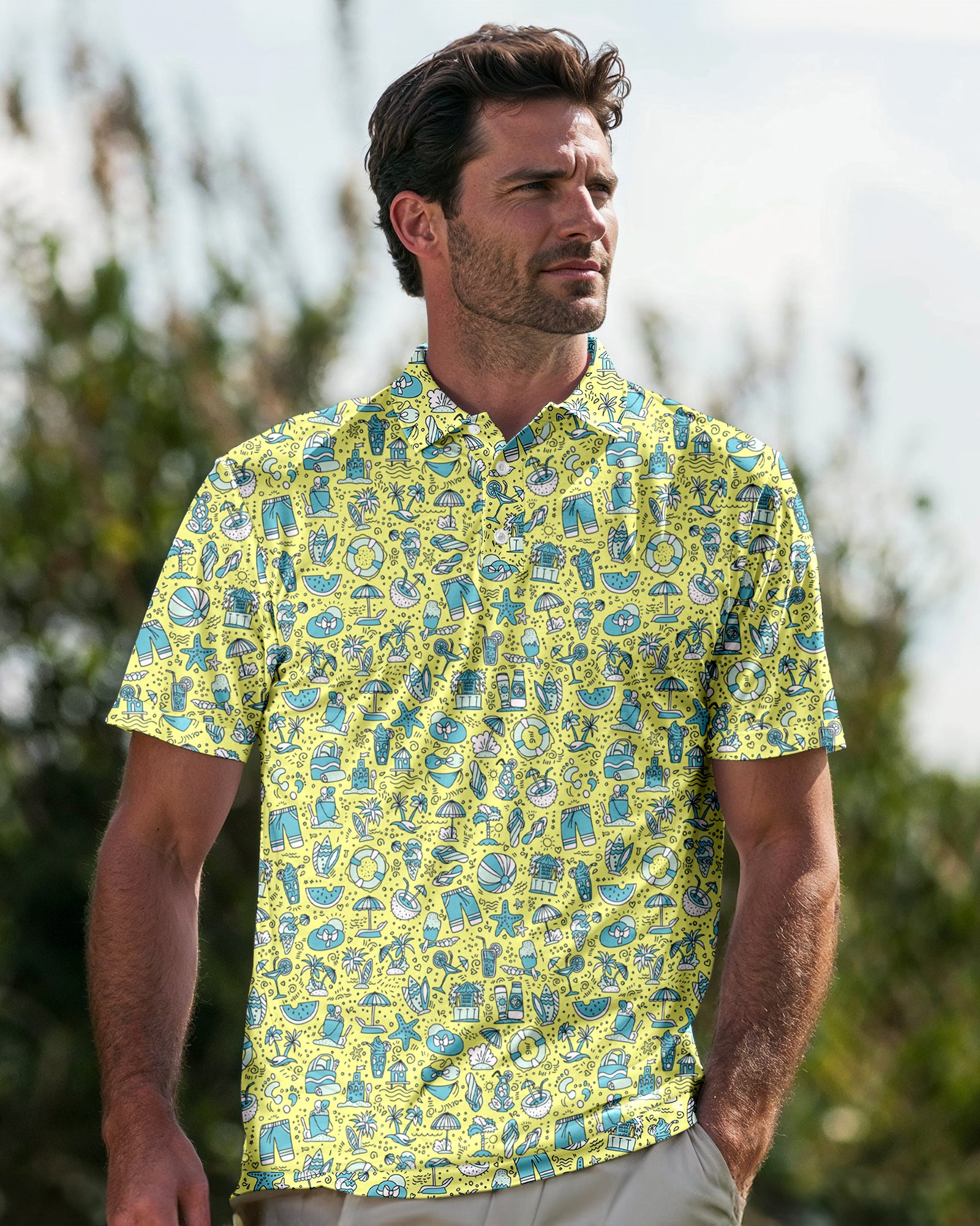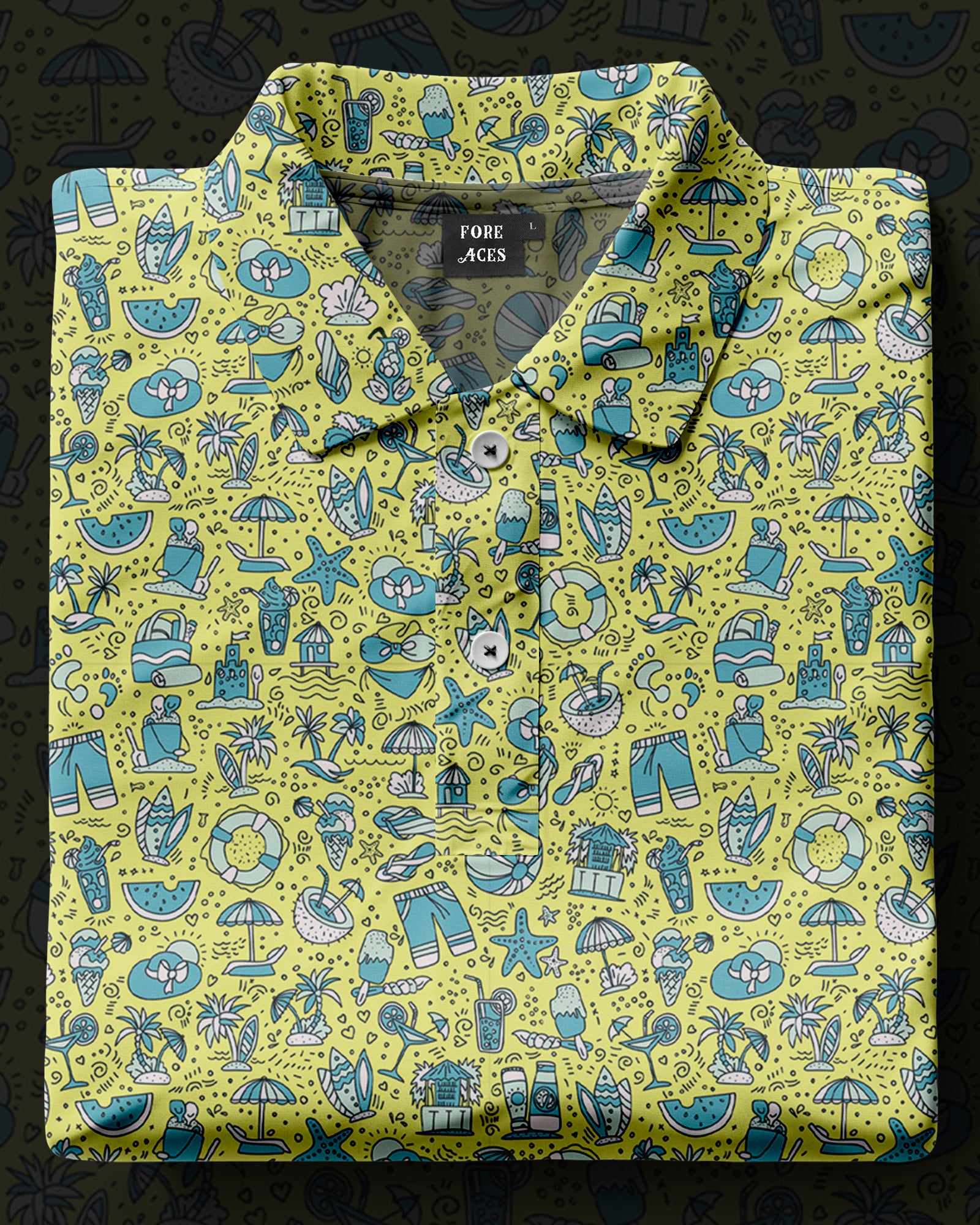 Catch some waves and conquer the fairways with the 'Coastal Caddy' polo, bringing a beach vibe to your golf game. With palm trees swaying on the fabric, this shirt is your ticket to sandy adventures and hole-in-one dreams.
