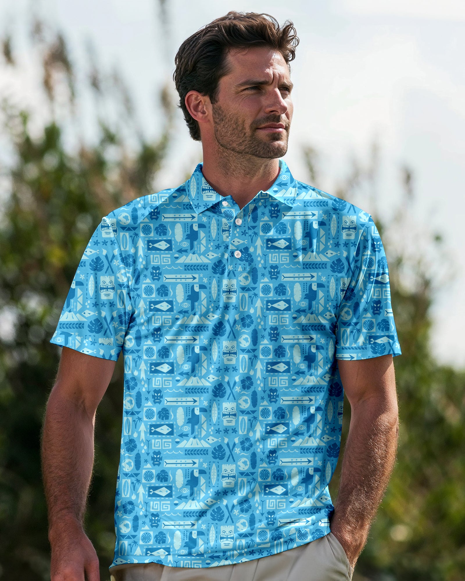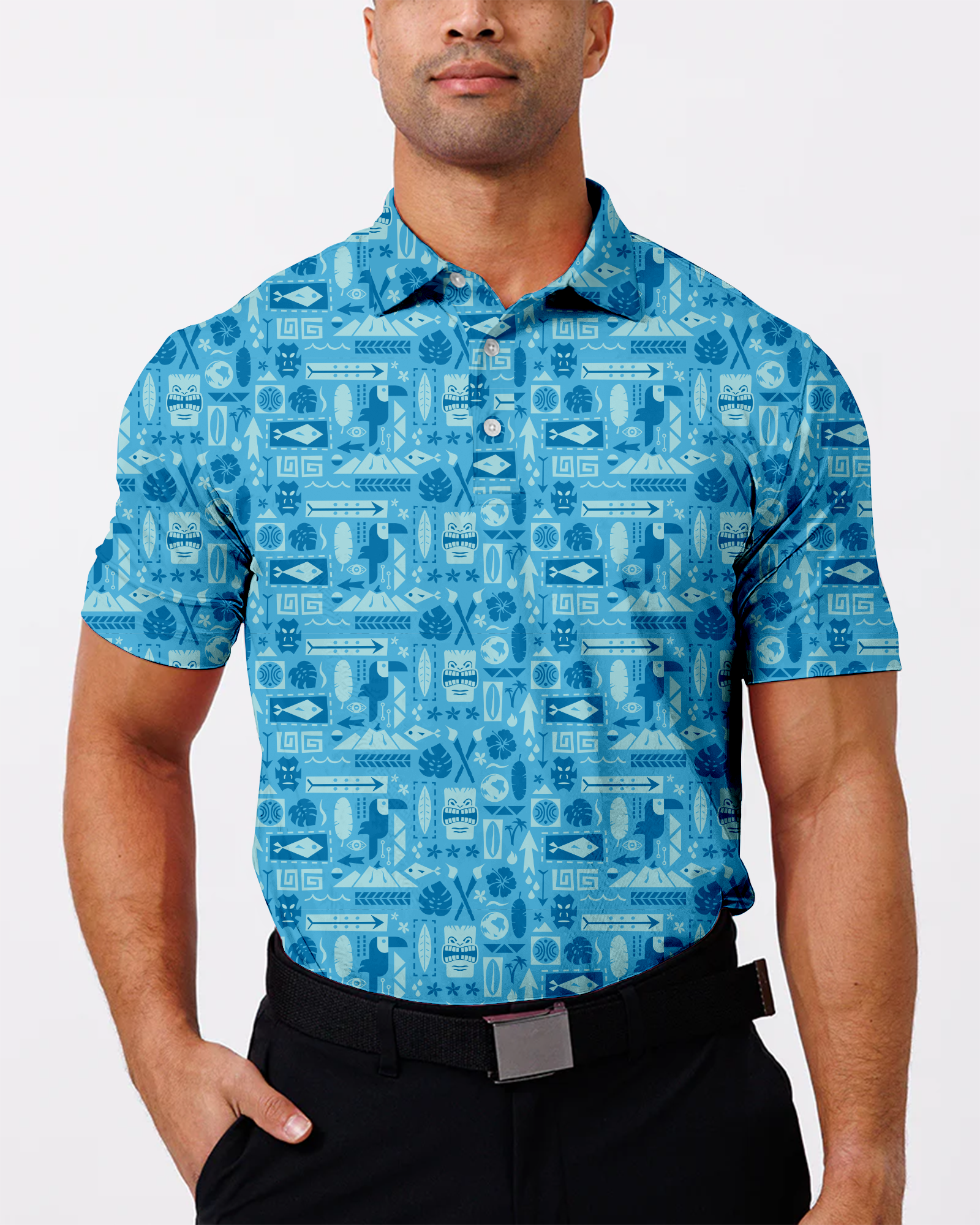 The Tiki Polo is the epitome of leisure meeting luxury on the golf course. With its lightweight fabric that offers both breathability and moisture-wicking properties, this polo ensures comfort and style in any situation. The modern, tailored fit flatters the physique without restricting movement, allowing for a seamless transition from the fairway to the clubhouse. The vibrant design, inspired by tropical landscapes, adds a touch of fun to the classic polo, making it a standout piece for any golfer's wardrobe. For those looking to make a statement while enjoying the game, the Tiki Polo is a perfect choice.