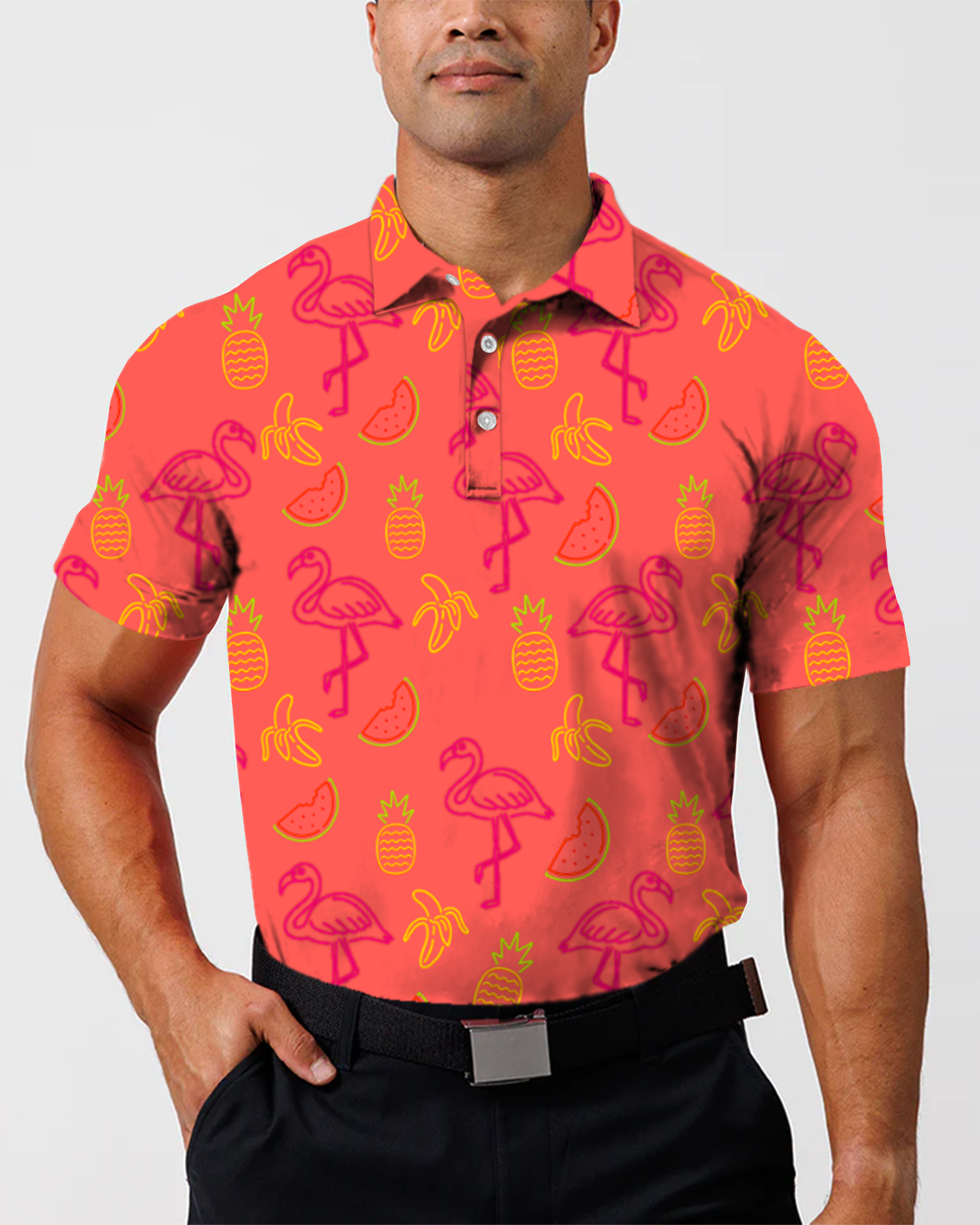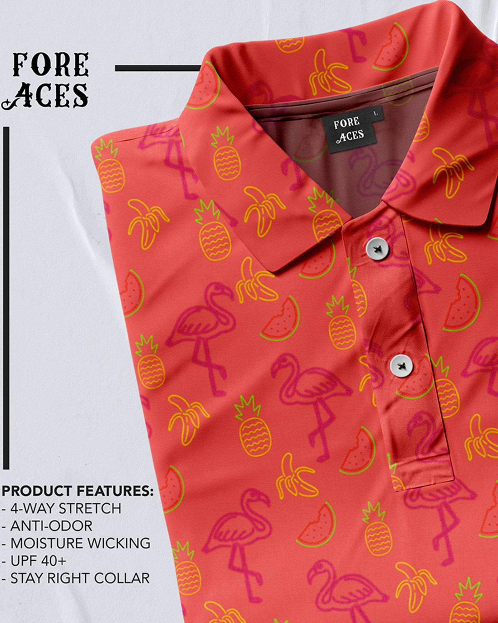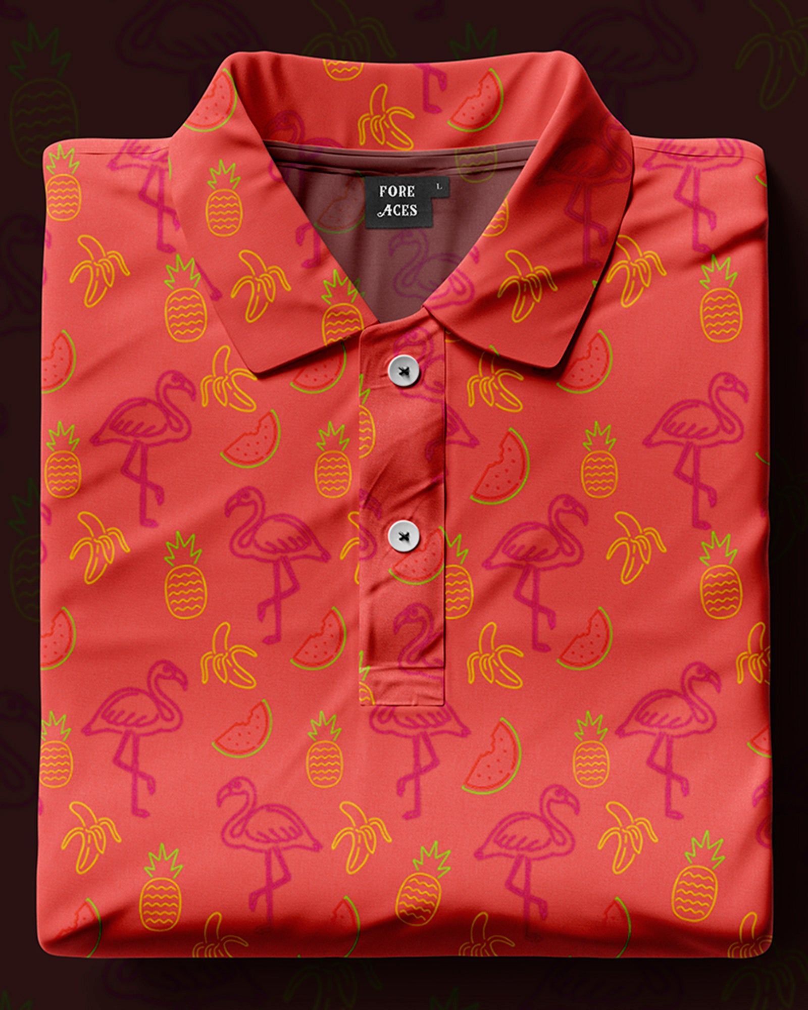 Introducing our bold Tropicana Tango Polo, designed to make a statement on the green. With their eye-catching colors and patterns, this polo is sure to turn heads and add some fun to your golf game. Made from high-quality materials, this polo offers both comfort and style, making it a must-have for any golfer looking to stand out from the crowd.