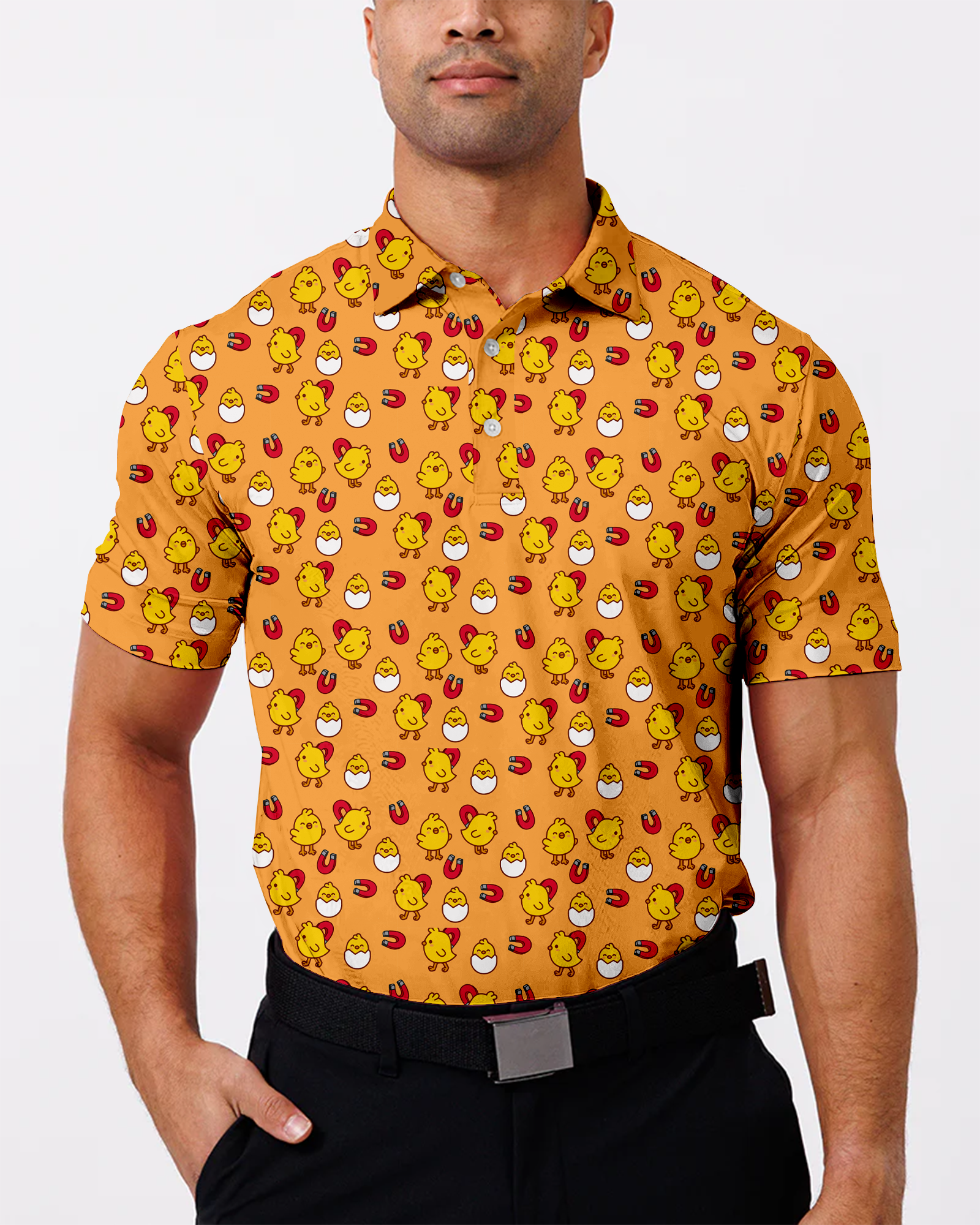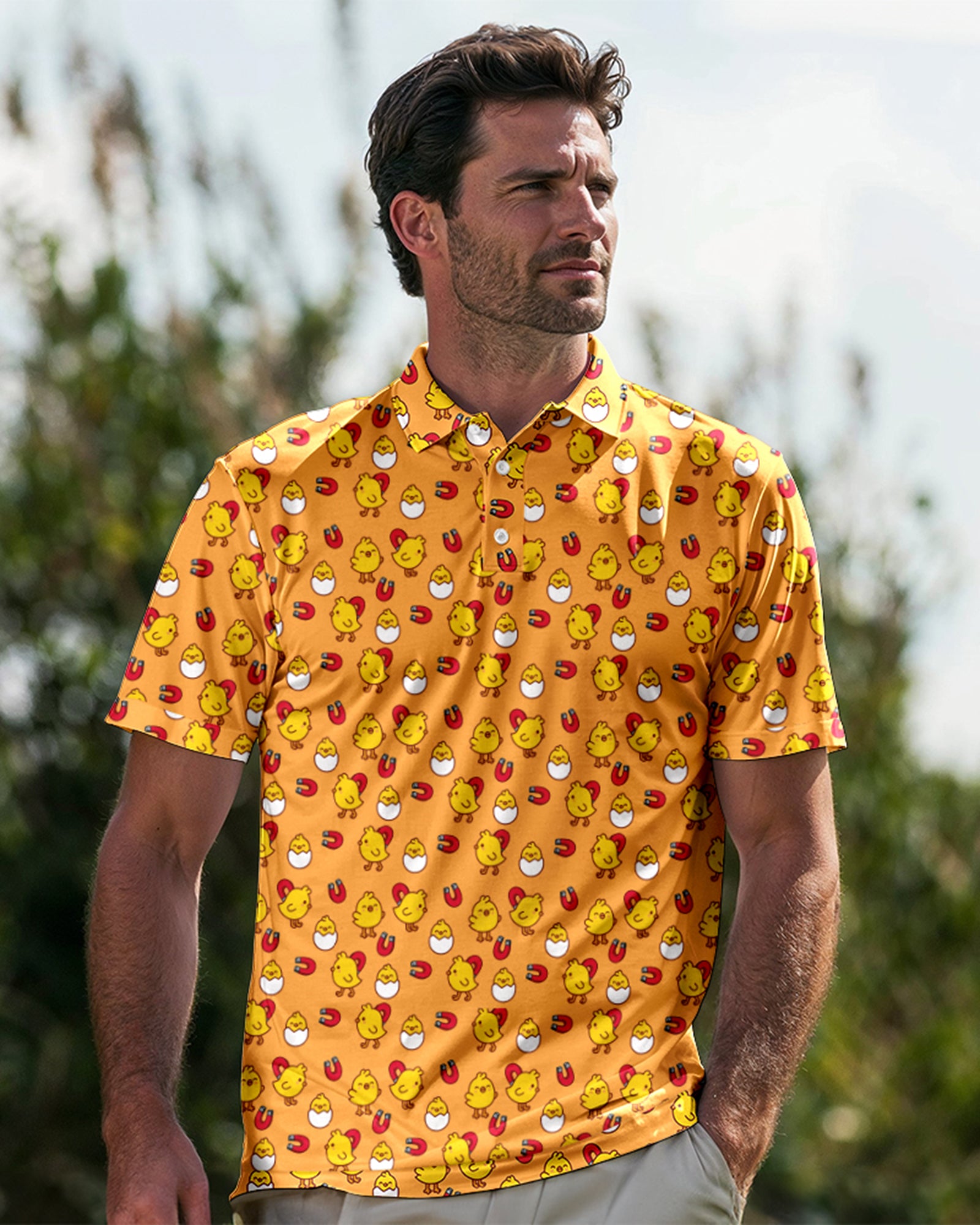 Get ready to tee off with a smile in our Cheerful Chick Magnet Polo! This fun golf shirt combines adult humor with a playful design, making it the perfect choice for those who love to stand out on the course. Made from comfortable, breathable fabric, it’s ideal for sunny days and will surely attract attention—both on and off the green. Whether you're hitting the links or just hanging out, this polo is sure to bring a laugh and a good time!